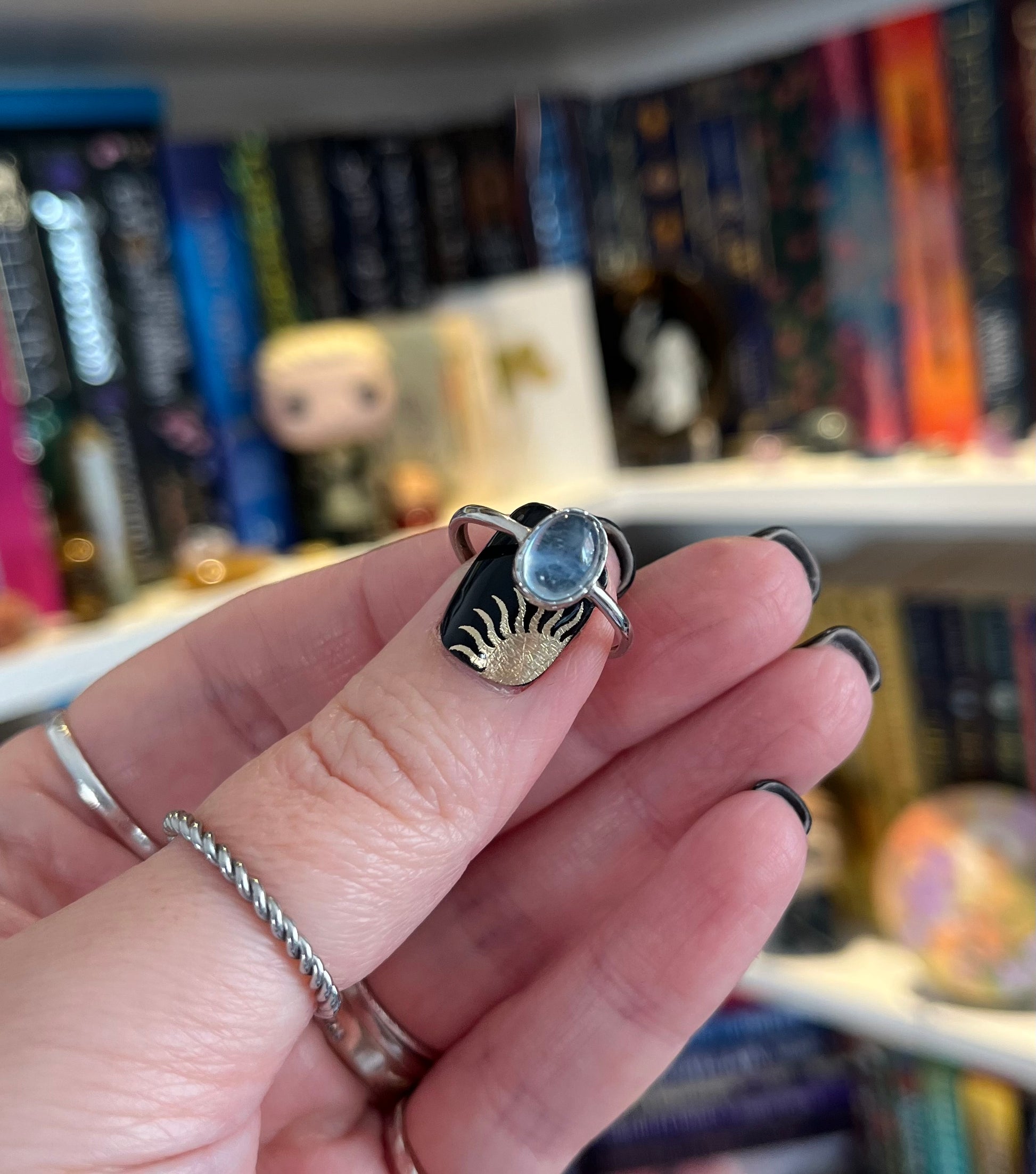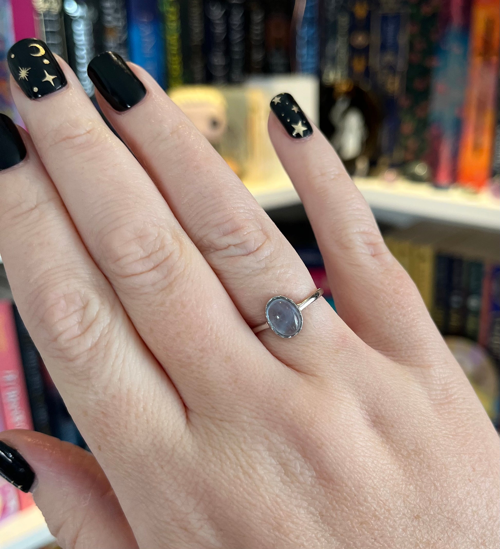 A stylish 925 sterling silver adjustable ring featuring a natural Aquamarine gemstone. The soft blue tones of Aquamarine make this ring a versatile piece that adds a subtle touch of colour to any outfit. Each stone is naturally unique, giving every ring its own charm.