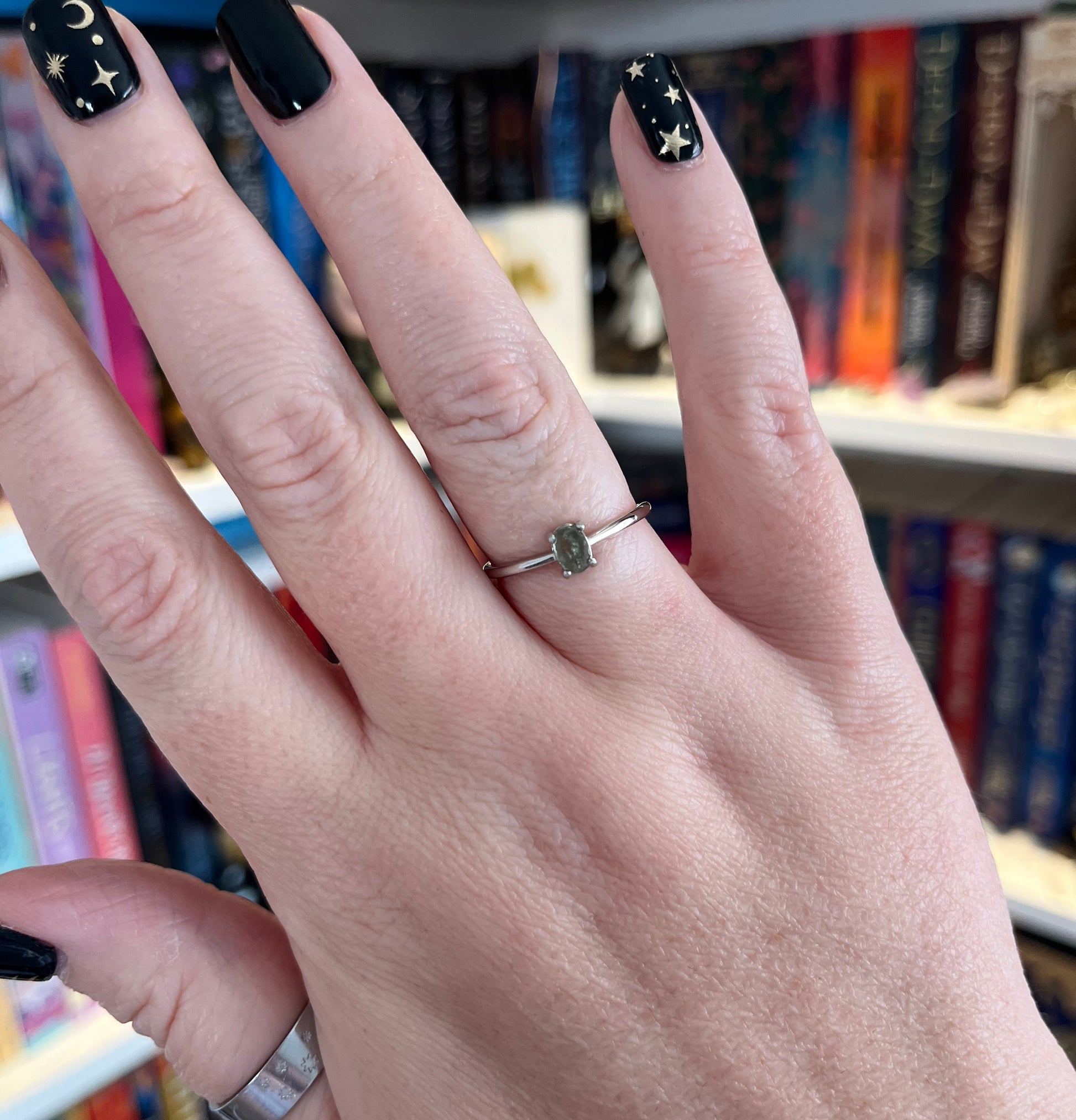 A beautifully crafted 925 sterling silver adjustable ring featuring a genuine piece of raw Moldavite. Each stone is naturally unique, giving every ring its own character and charm.