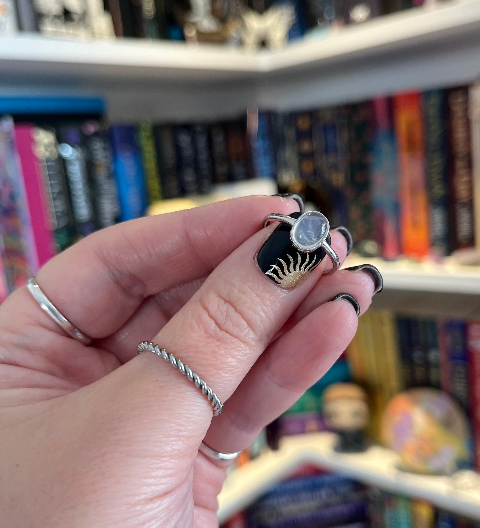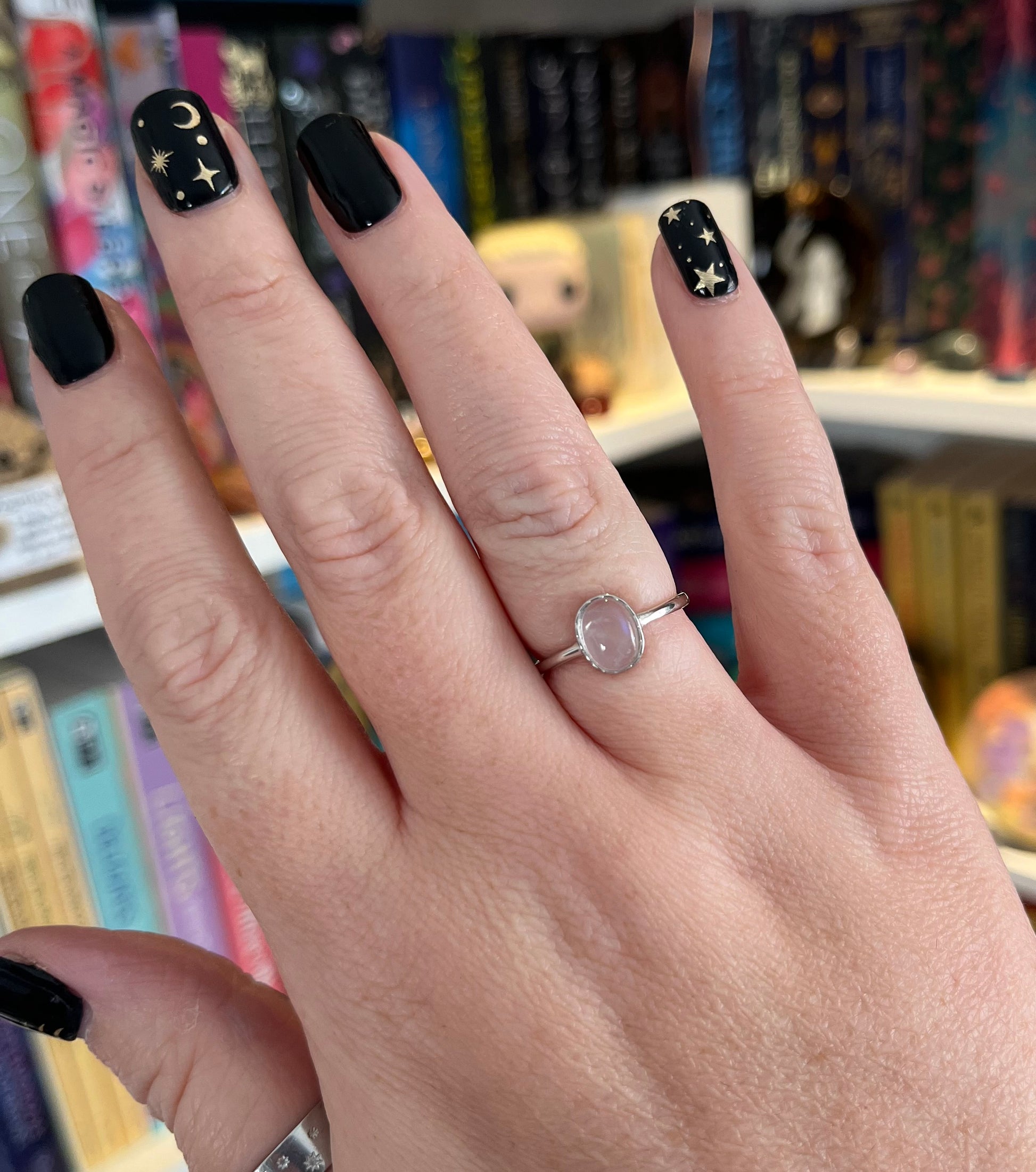 A timeless 925 sterling silver adjustable ring featuring a natural Moonstone with a striking blue flash. Each stone is cut and set to highlight its unique play of light, making every piece beautifully individual.