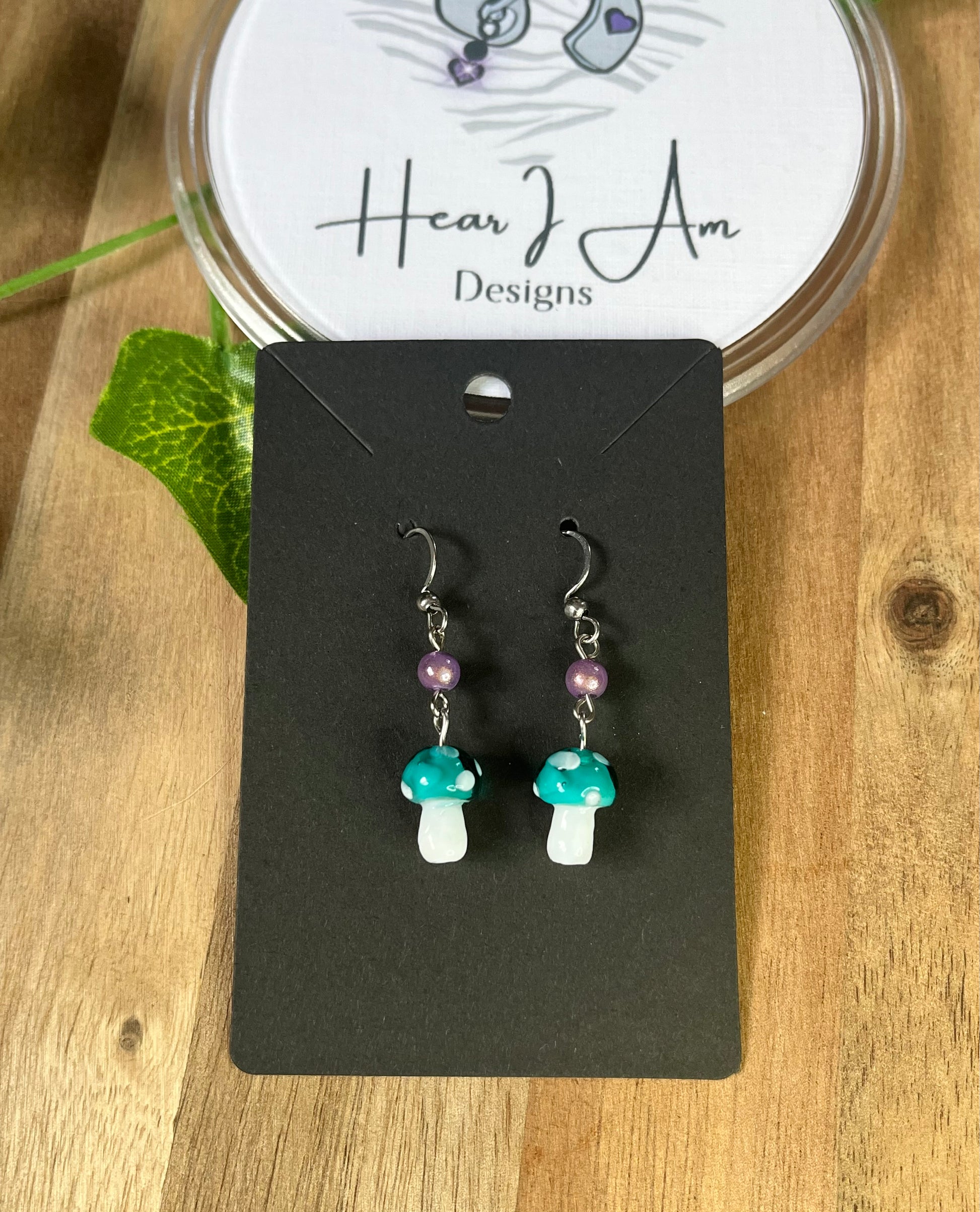 Complete the look with our matching Aqua Mushroom Earrings – a whimsical accessory to pair with our best-selling necklace! These earrings feature delicate glass mushroom beads in a soft aqua hue, paired with iridescent accents and finished on hypoallergenic stainless steel loops for comfort and durability.