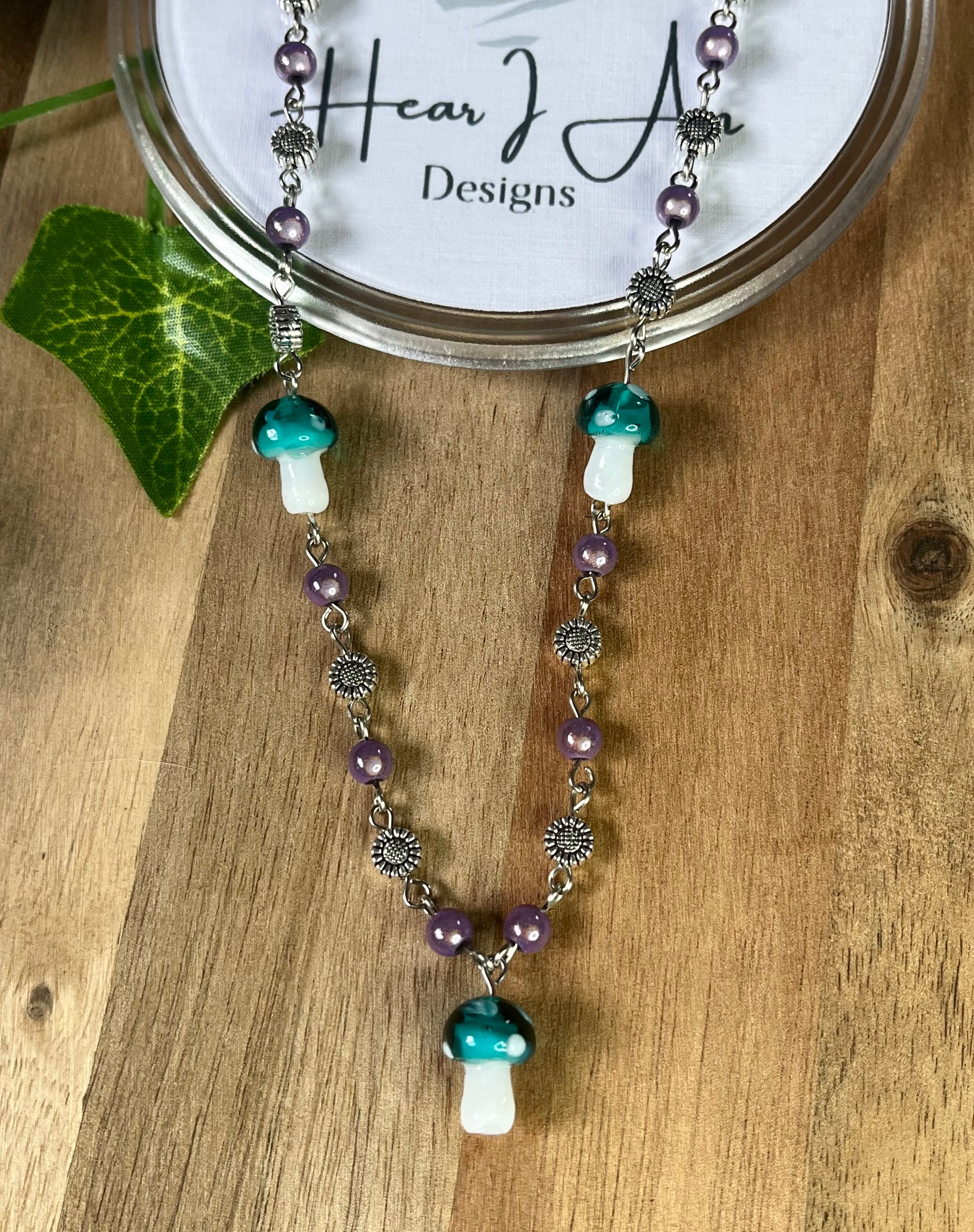 Add a touch of whimsical charm to your look with our handmade aqua mushroom necklace. Featuring delicate glass mushroom beads paired with iridescent purple beads, each piece is carefully linked together using durable stainless steel wire for lasting shine and strength.