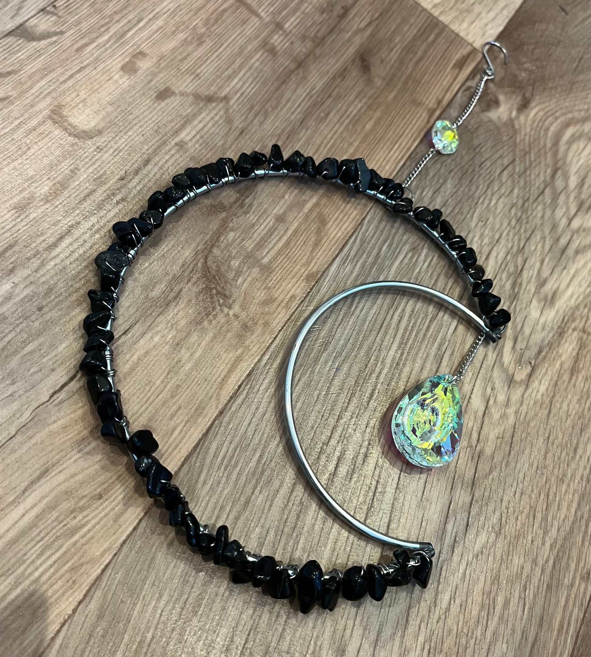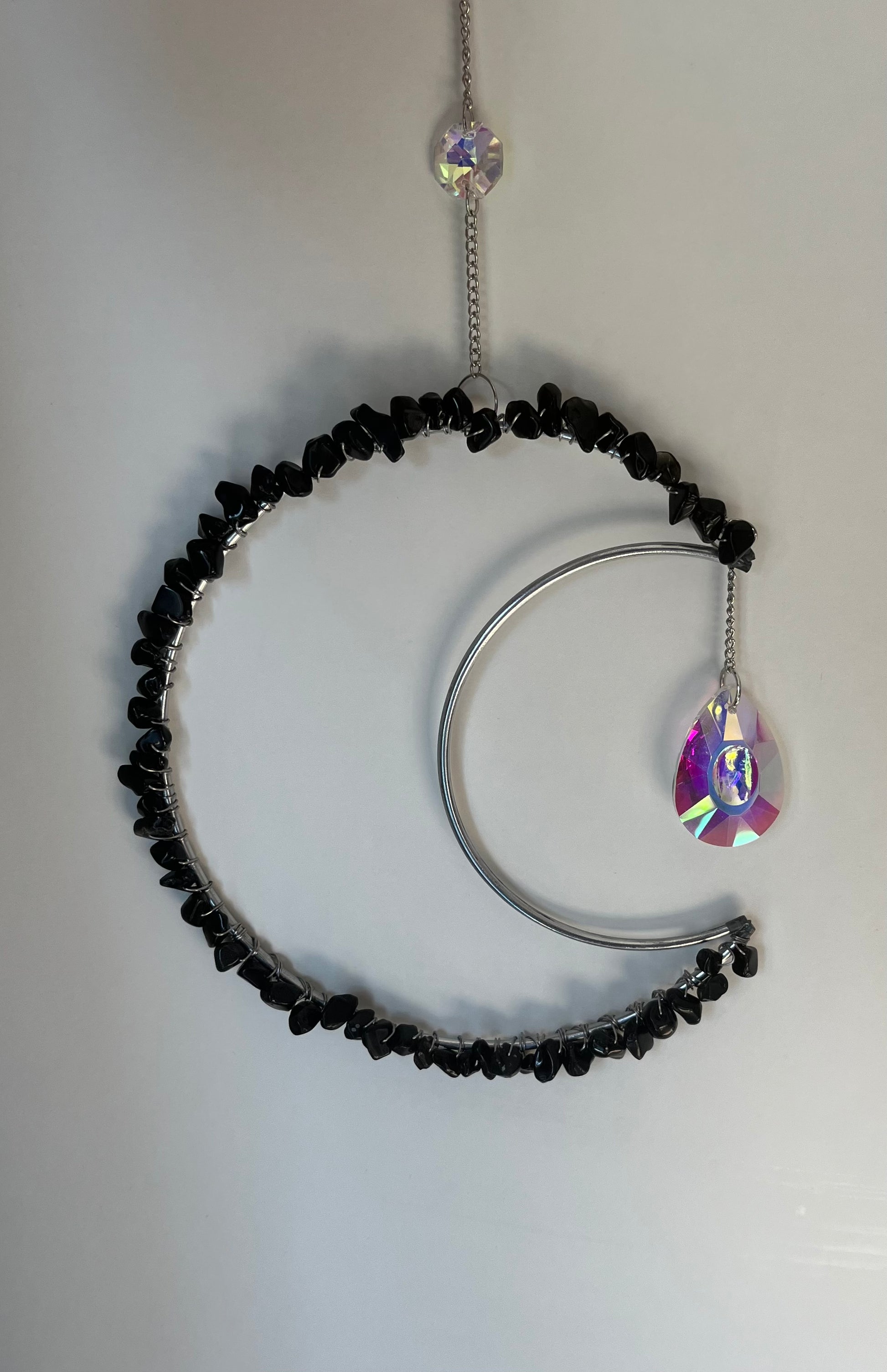Add subtle light and texture to your space with our hand-beaded moon shaped Black Obsidian Chip Suncatcher.