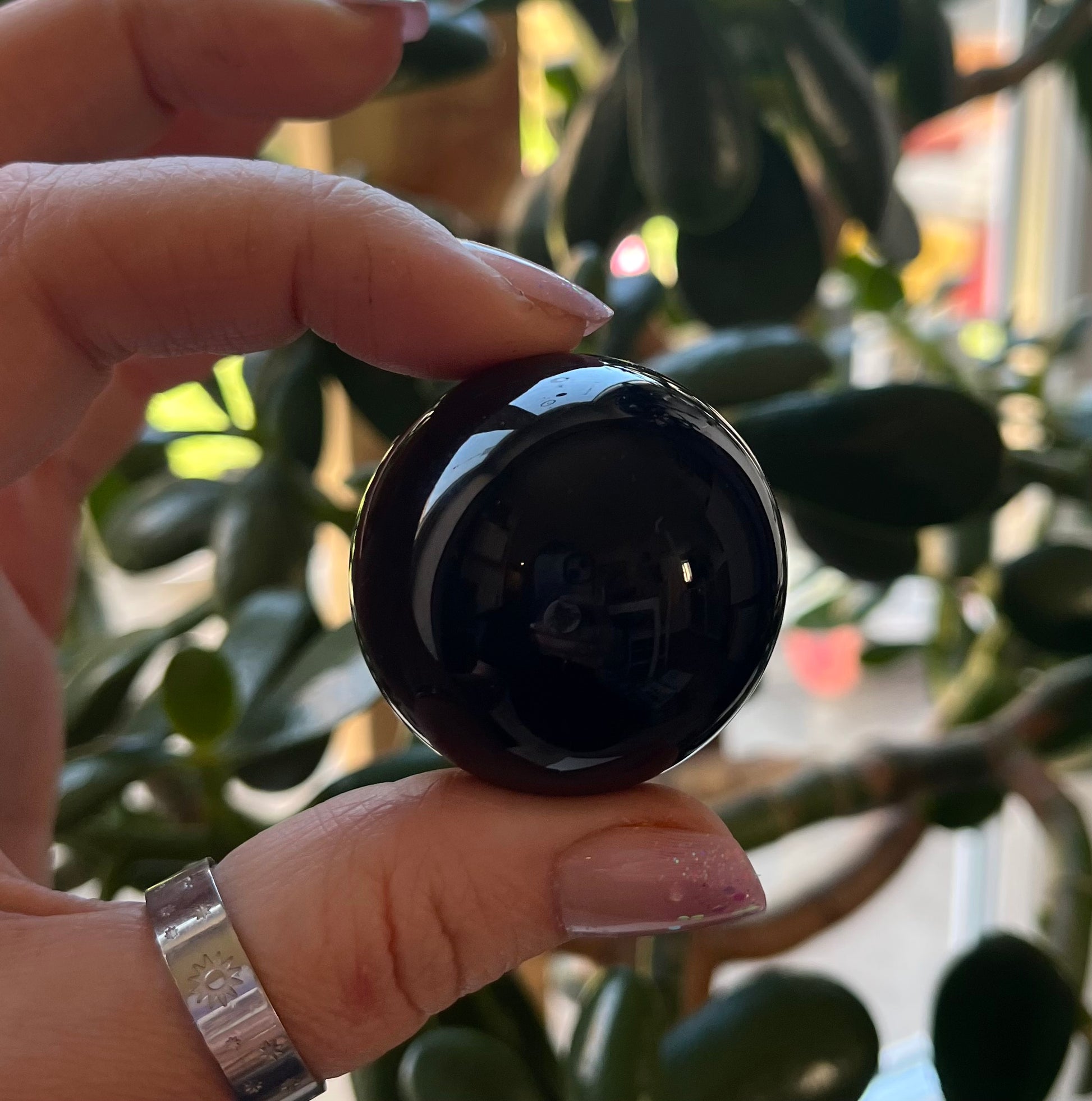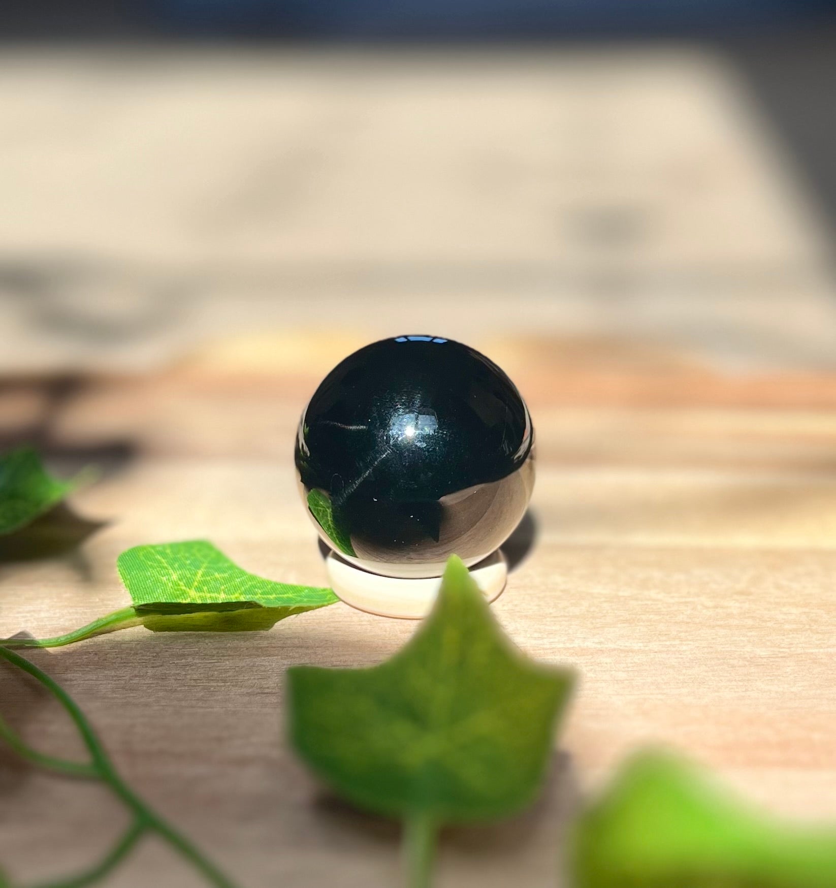 This 4 cm Black Obsidian Sphere is a sleek and striking decorative piece, hand-polished to a smooth, glossy finish. Its deep black colour and reflective surface make it a bold accent for any shelf, desk, or display area. Each sphere comes with a complimentary wooden stand to showcase it beautifully right out of the box.