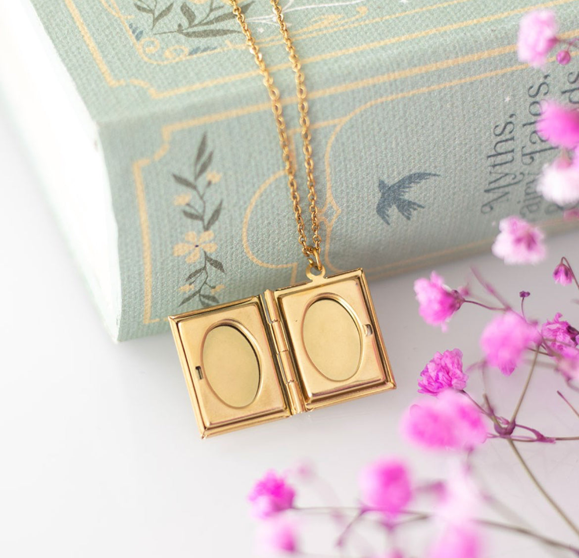 This gold-toned locket necklace opens like a miniature book, making it a treasured keepsake for book lovers who carry stories close to their heart.