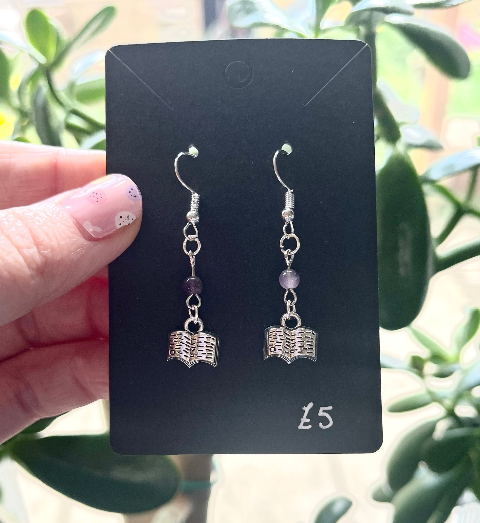 Perfect for book lovers, these earrings feature miniature metal book charms paired with rich amethyst beads. Crafted from zinc alloy (lead and nickel safe) and finished with silver-plated hooks for everyday comfort.