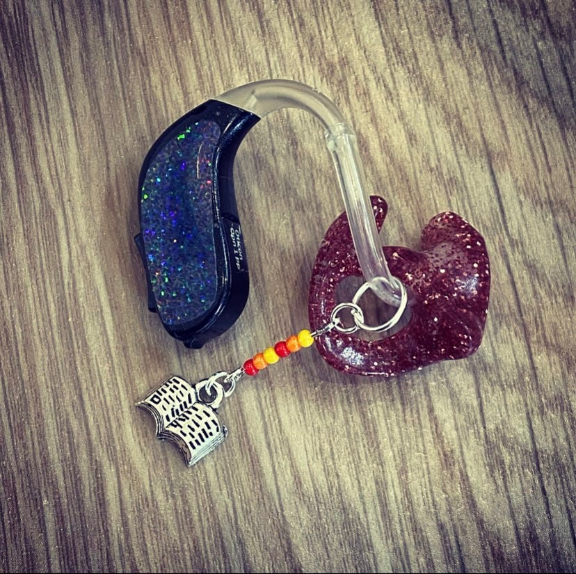 Perfect for book lovers, these hearing aid charms feature miniature metal book charms, paired with plastic beads and silver-plated hoops. A subtle way to personalise your hearing aids with a literary touch.