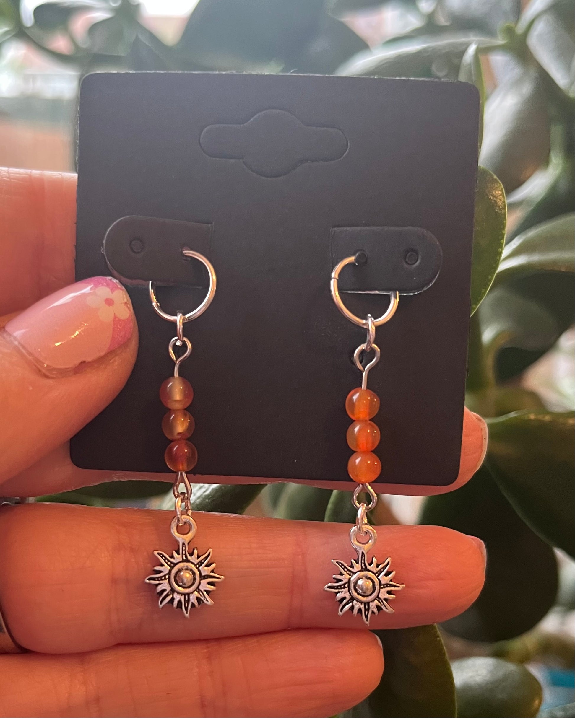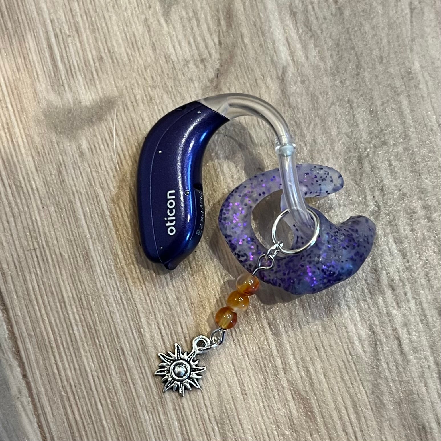 Bring a little sunshine to your day with these radiant hearing aid charms featuring silver-tone sun charms and rich, fiery carnelian beads. These cheerful accessories are perfect for adding warmth, personality, and a hint of bold energy to your hearing aids.