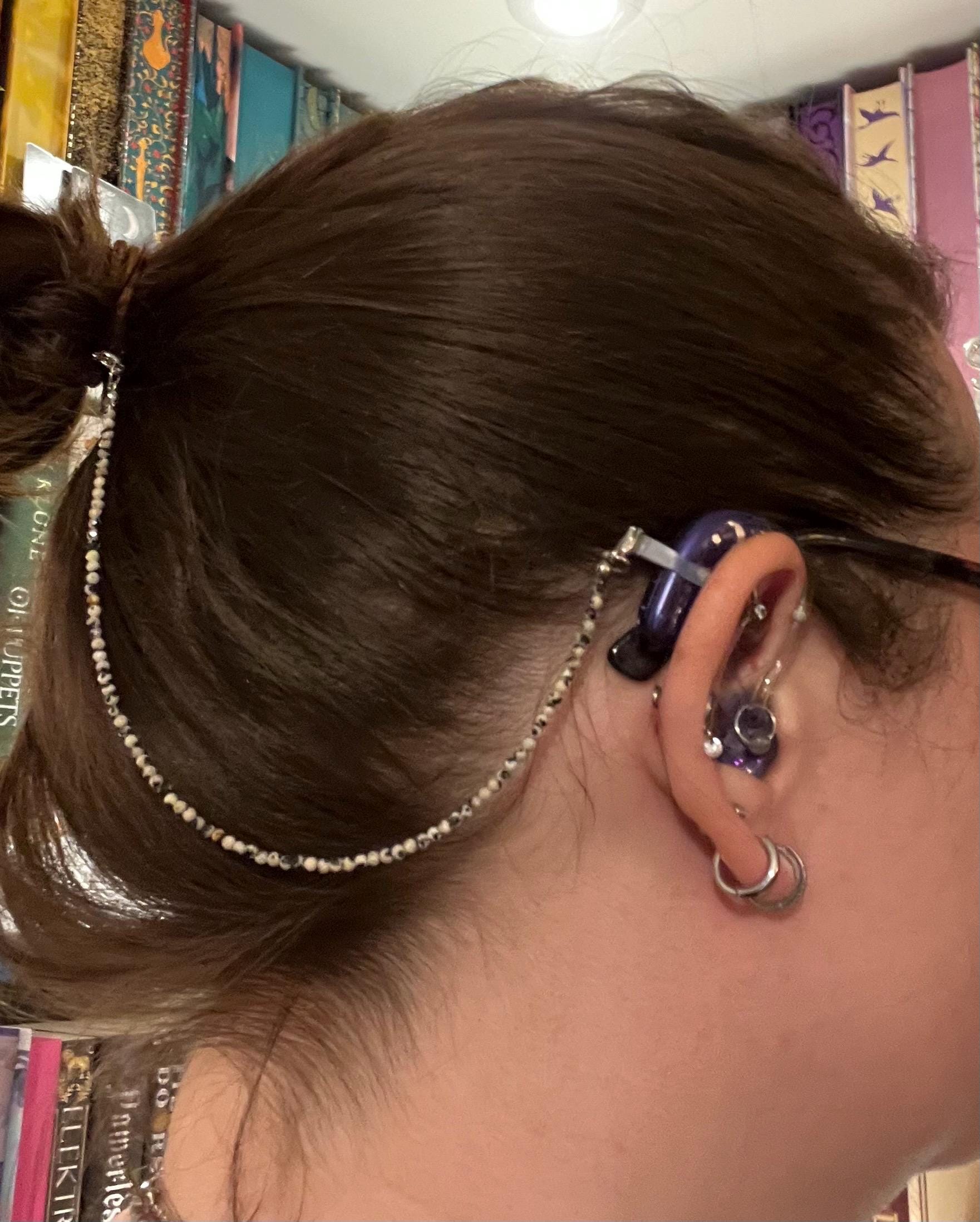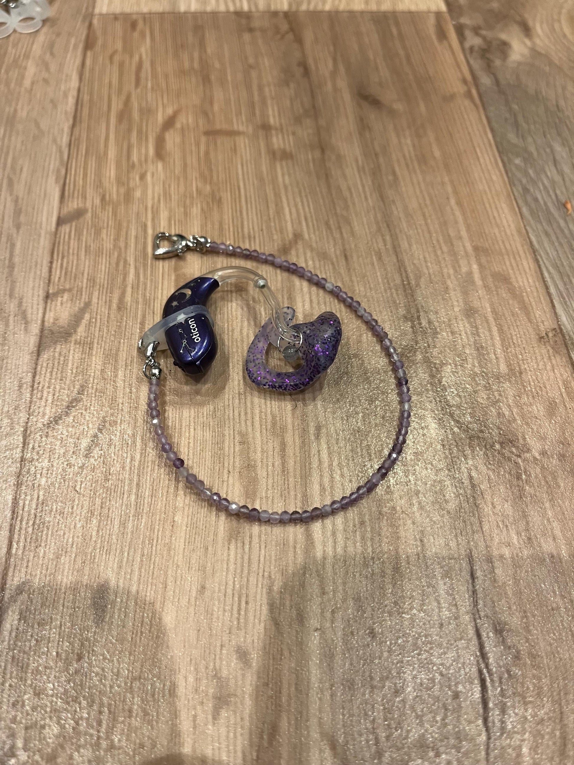 Each retainer is handmade with durable, lightweight wire and genuine crystal beads for a secure fit with a touch of sparkle. A silicone loop attaches to your hearing aid, while a silver-plated clip fastens to a hair tie or bobble to help keep your device in place.