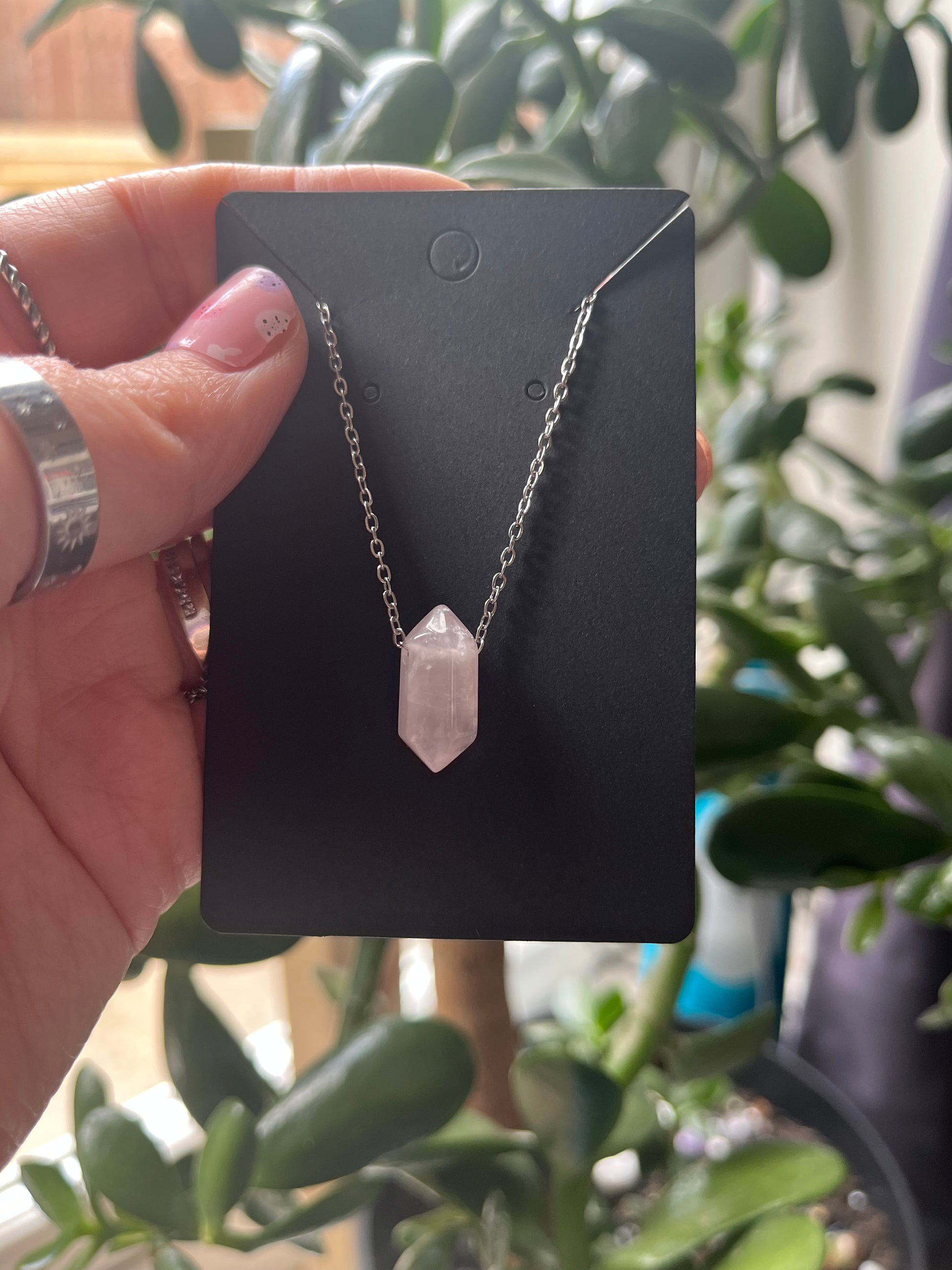 These Crystal DT (Double Terminated) Point Pendants feature polished crystal points hanging from stainless steel chain. They are both durable and lightweight, making them an easy addition to any outfit.