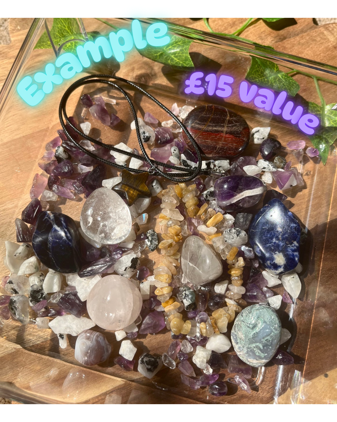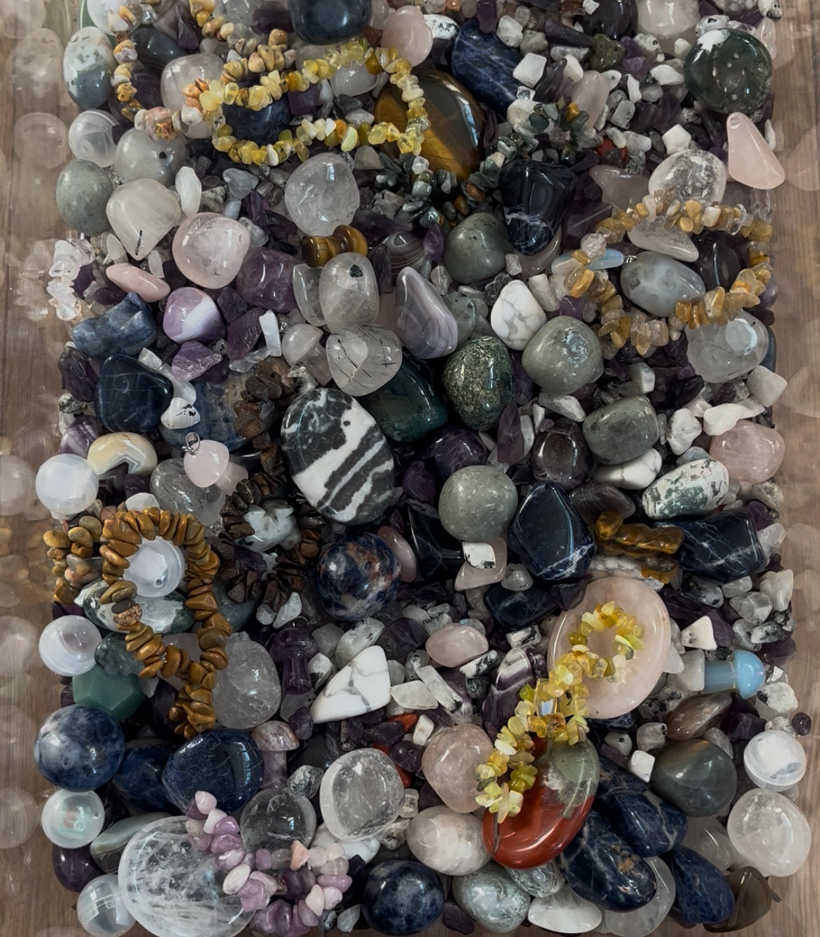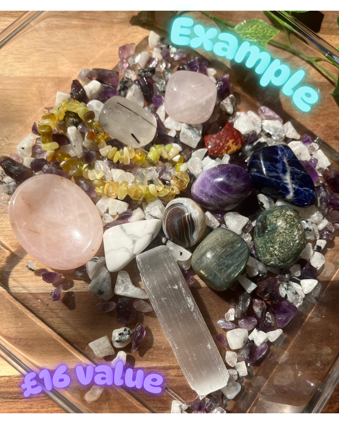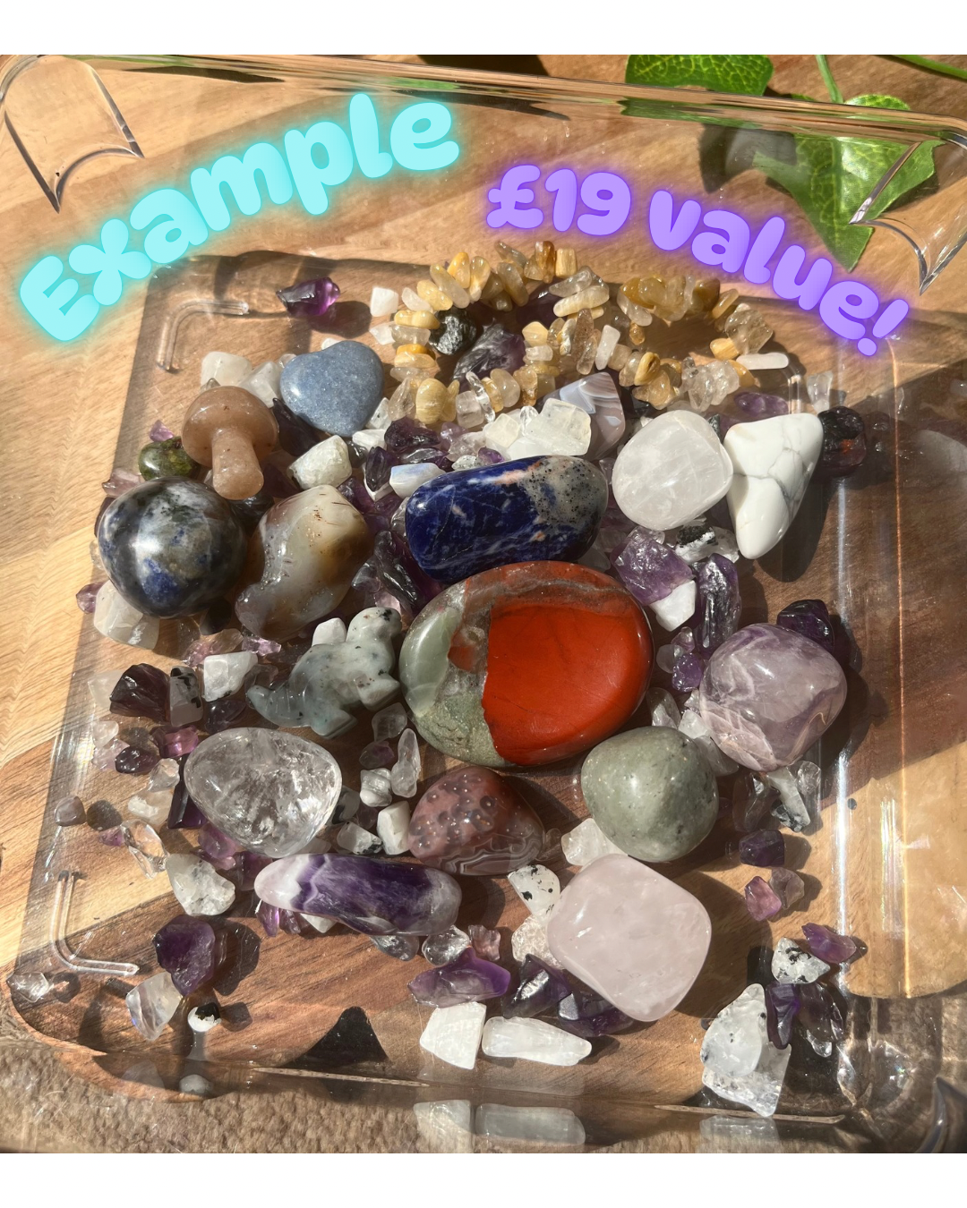 Each scoop is randomly chosen from our mixed crystal collection and may include a mix of sizes and types. While we do our best to create a balanced assortment, no specific items can be guaranteed. That’s part of the fun!