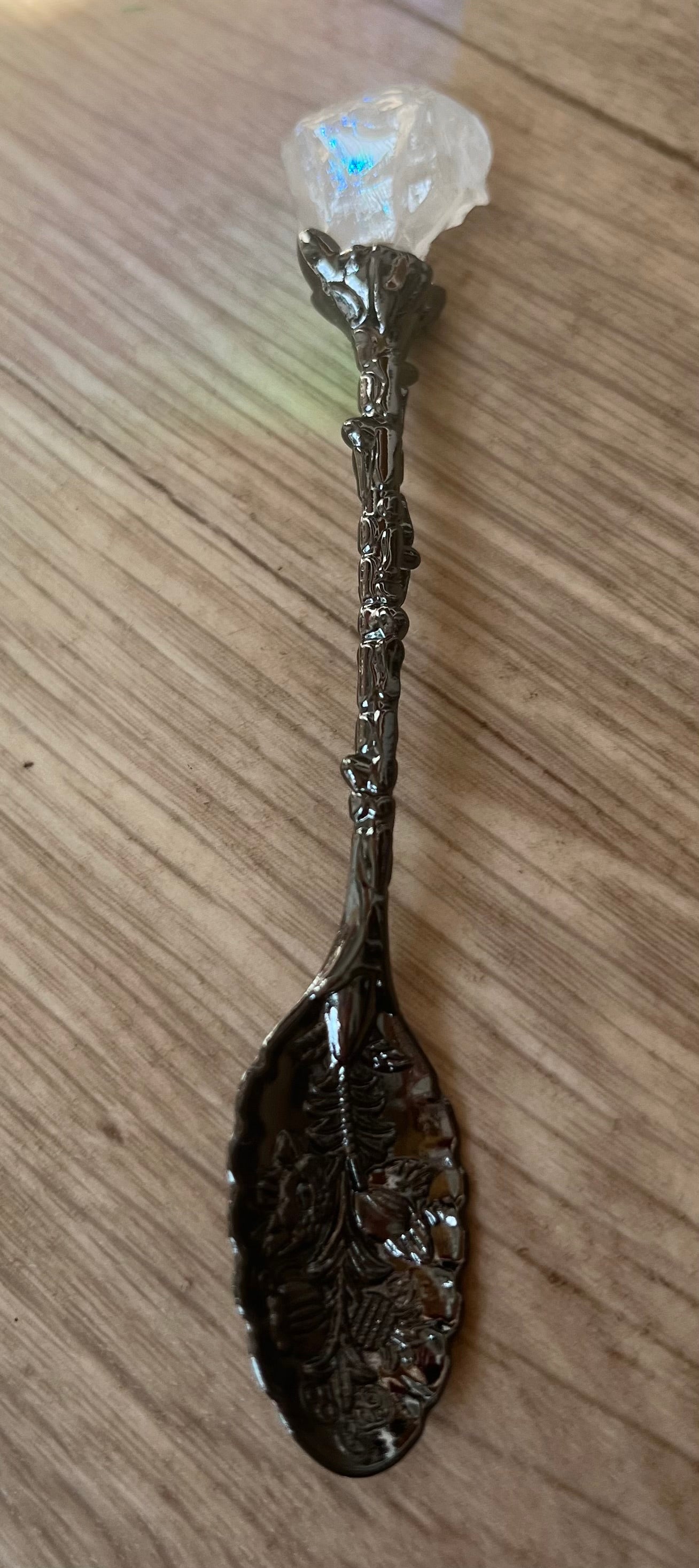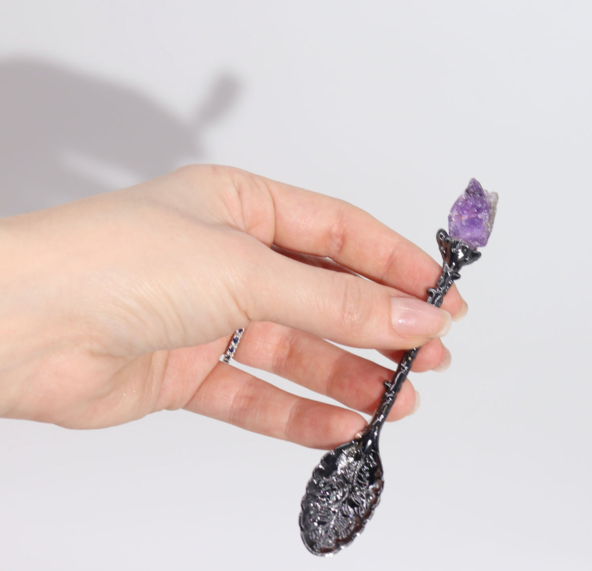 - Each spoon is unique, with slight variations in crystal colour and shape