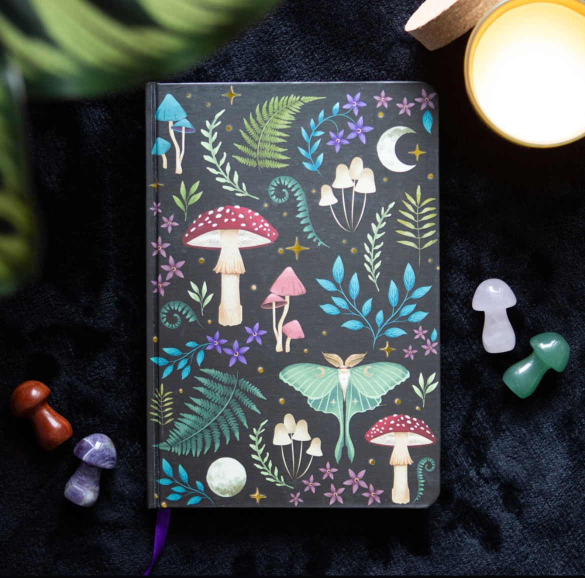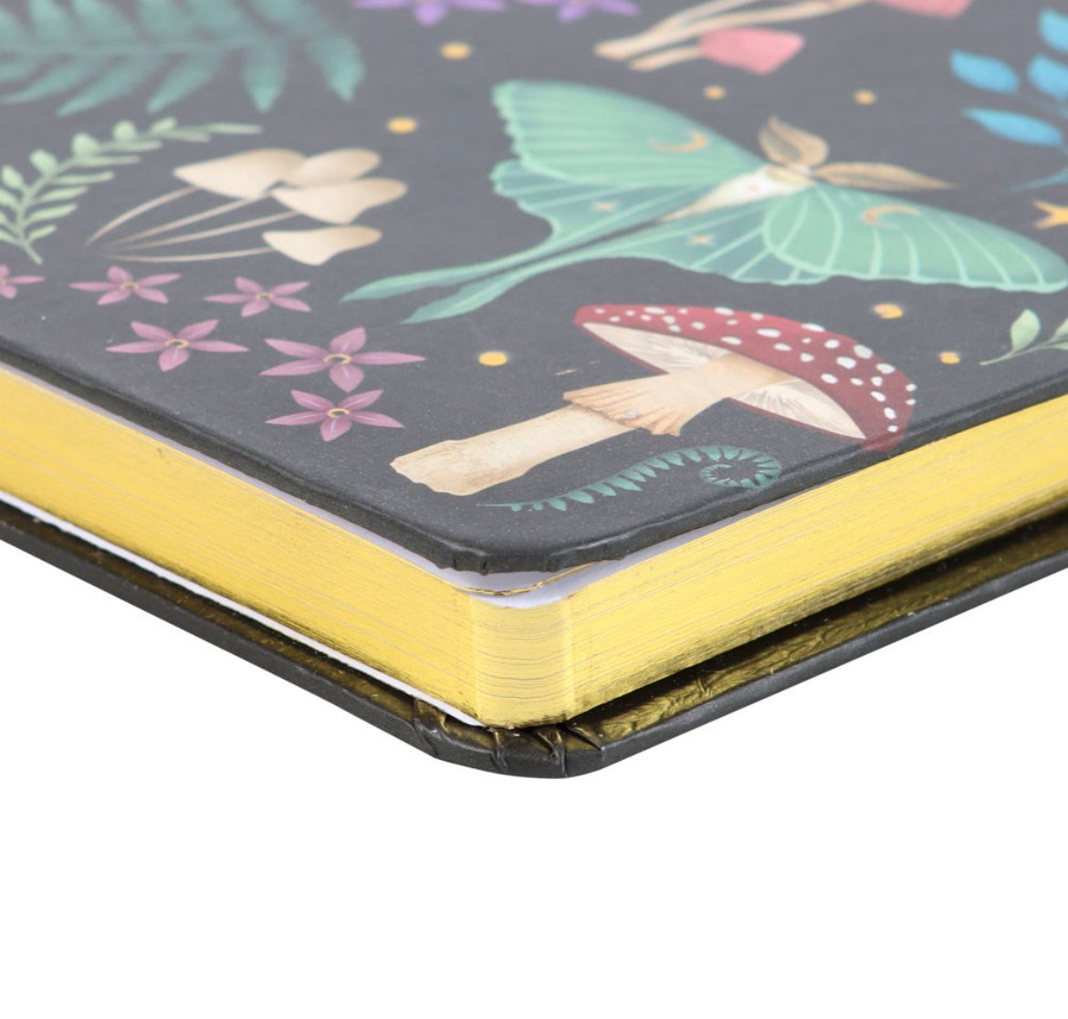 Mystical mushrooms, a glowing luna moth and magickal plants are accented by gold foil page edges and a ribbon marker.