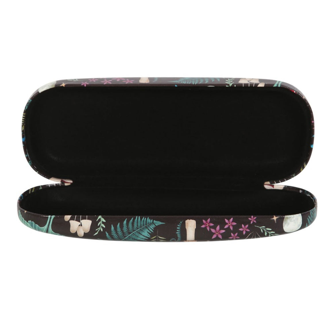 A hard shell glasses case featuring an all-over mystical forest print featuring mushrooms, moths and magical plants.