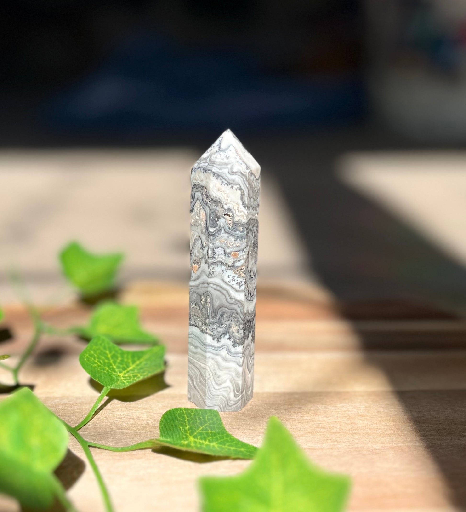 This 9.5cm Dendritic Calcite Tower features intricate branching inclusions that resemble natural plant-like patterns, beautifully suspended within a creamy to translucent calcite base. With its smooth polish and organic markings, this tower is a striking piece of natural art.