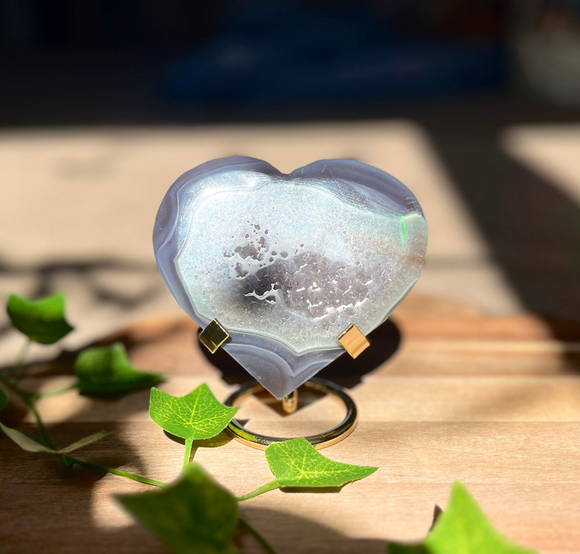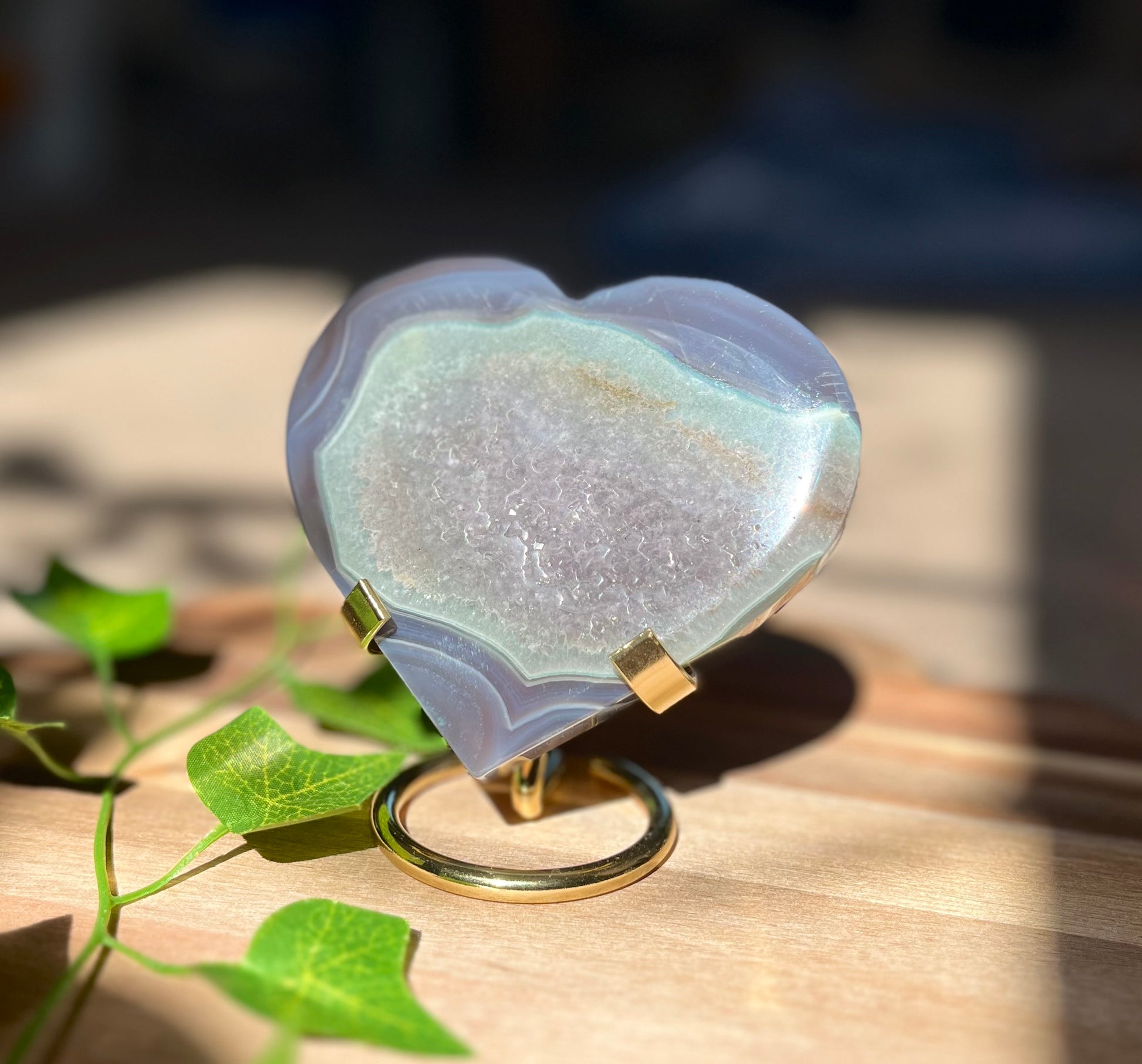 Showcase natural elegance with this stunning 10cm wide Druzy Agate Heart displayed on a sleek gold metal stand. The sparkling druzy surface features tiny glittering crystals that catch the light beautifully, while the smooth agate edges provide a polished, organic contrast.