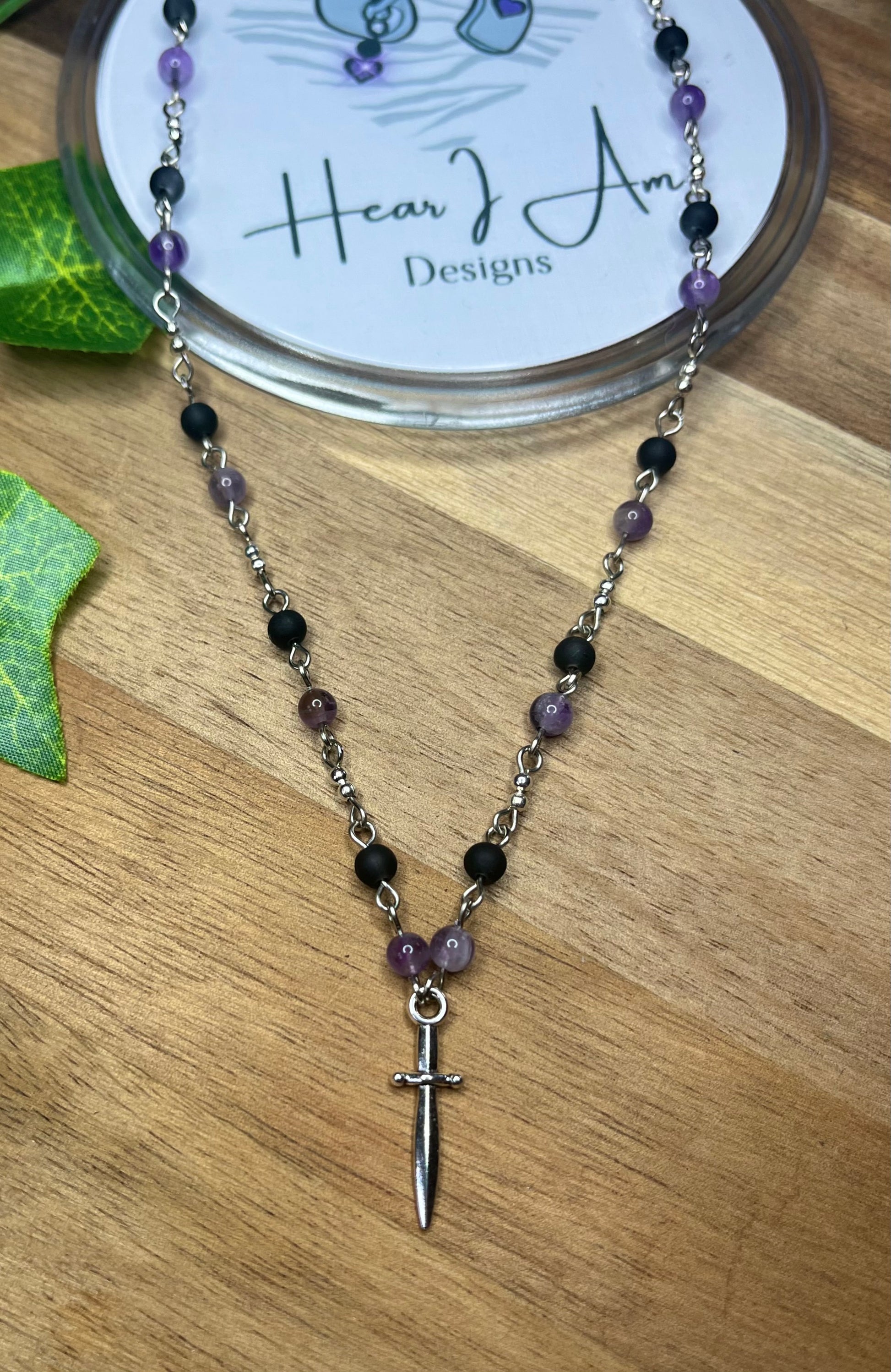 Channel bold, mystical energy with this fantasy-inspired dagger necklace, hand-beaded with amethyst, matte black glass beads, and finished with a striking dagger charm. Each piece is carefully crafted by hand, using durable stainless steel loops for strength, style, and long-lasting wear.