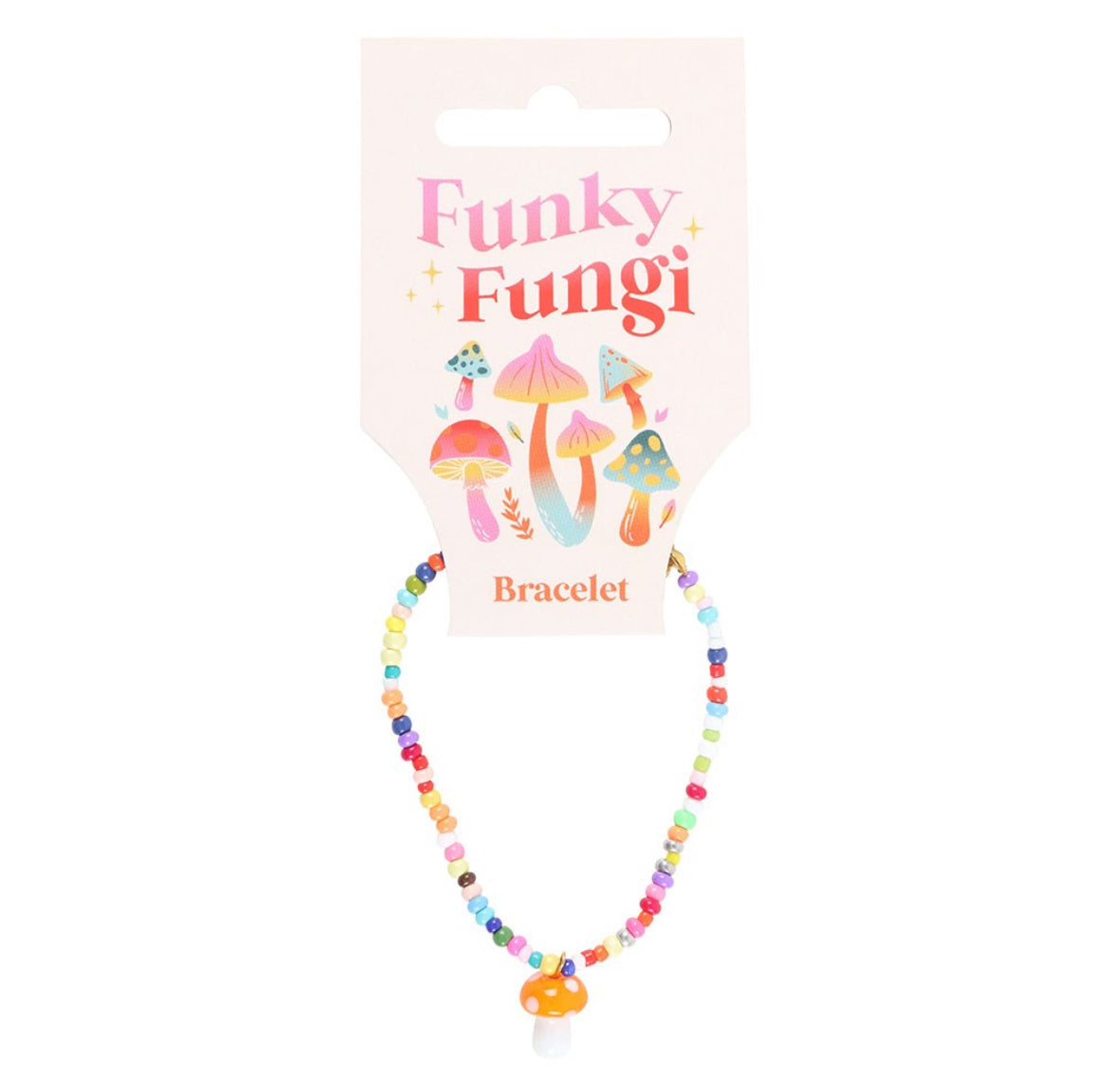 This delightful bracelet features an intricately designed glass orange toadstool mushroom and multicoloured beads