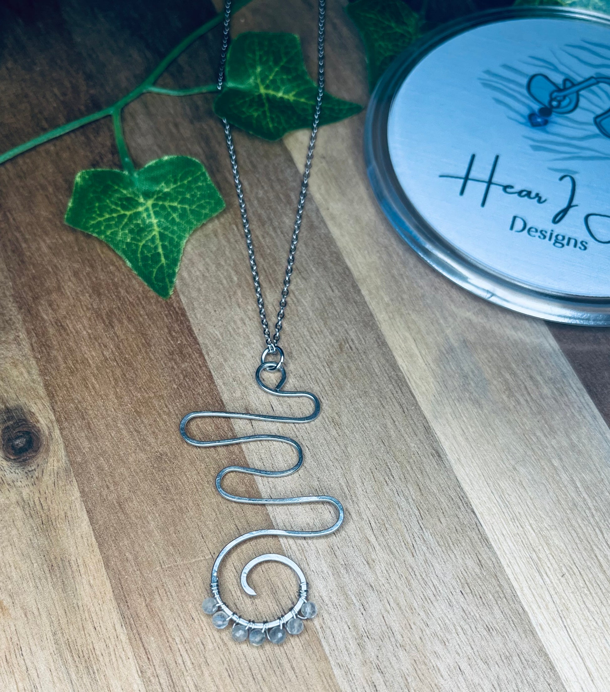 Crafted by hand, this stunning stainless steel pendant is a collaboration between myself and my husband. Each piece is shaped from stainless steel wire entirely by hand, then adorned with shimmering faceted Labradorite beads, individually wire-wrapped around the frame.