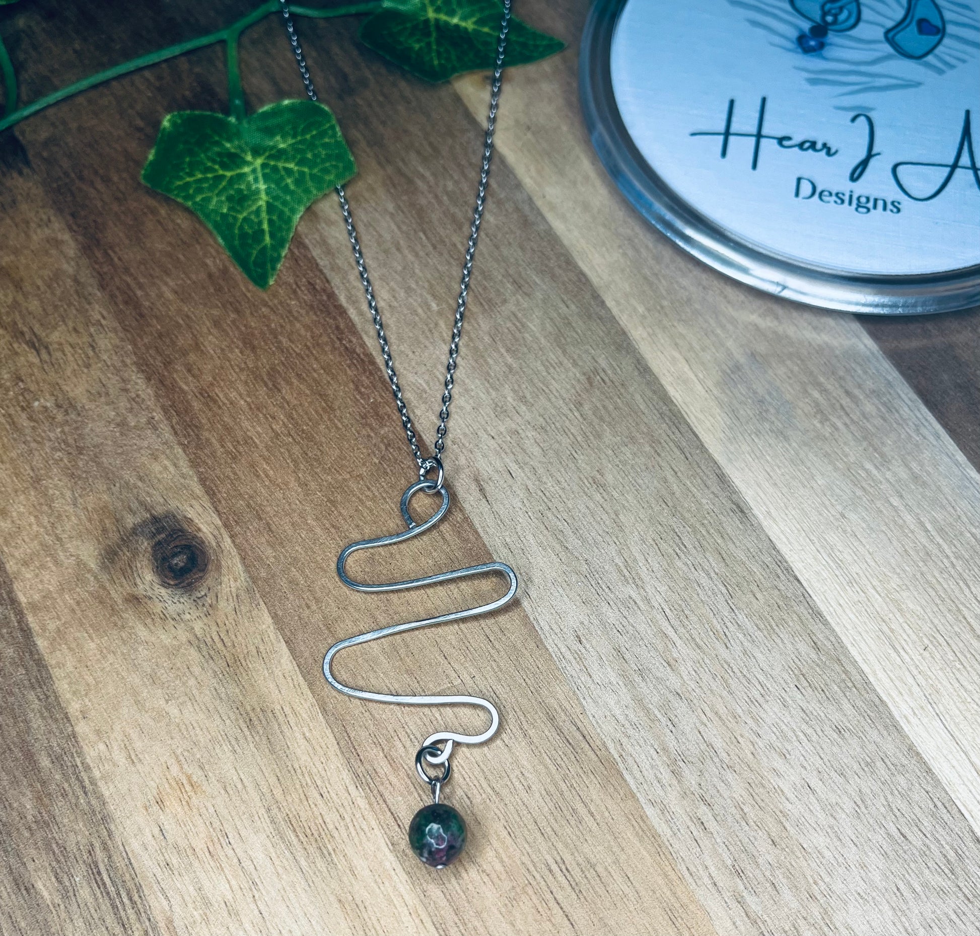 This unique pendant is a handcrafted collaboration between myself and my husband. I shape each design by hand using stainless steel wire, giving every piece its own organic flow and individuality. My husband then hammers the wire flat for added durability. At the centre of this pendant hangs a striking Ruby in Zoisite bead—a naturally occurring blend of vibrant green Zoisite and deep red Ruby, believed to promote vitality, passion, and emotional healing.