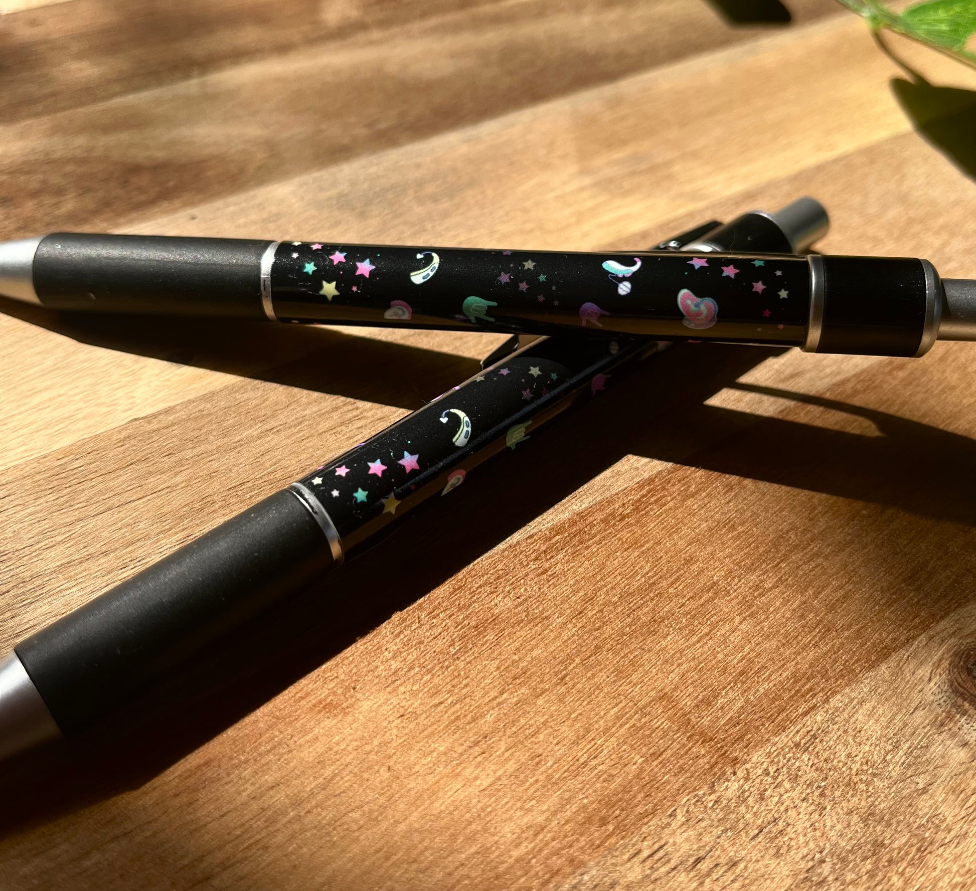 🖊️ Designed by me, this pen features a bold black background adorned with vibrant illustrations of hearing aids, cochlear implant processors, colourful stars, and the iconic ILY (I Love You) hand sign.