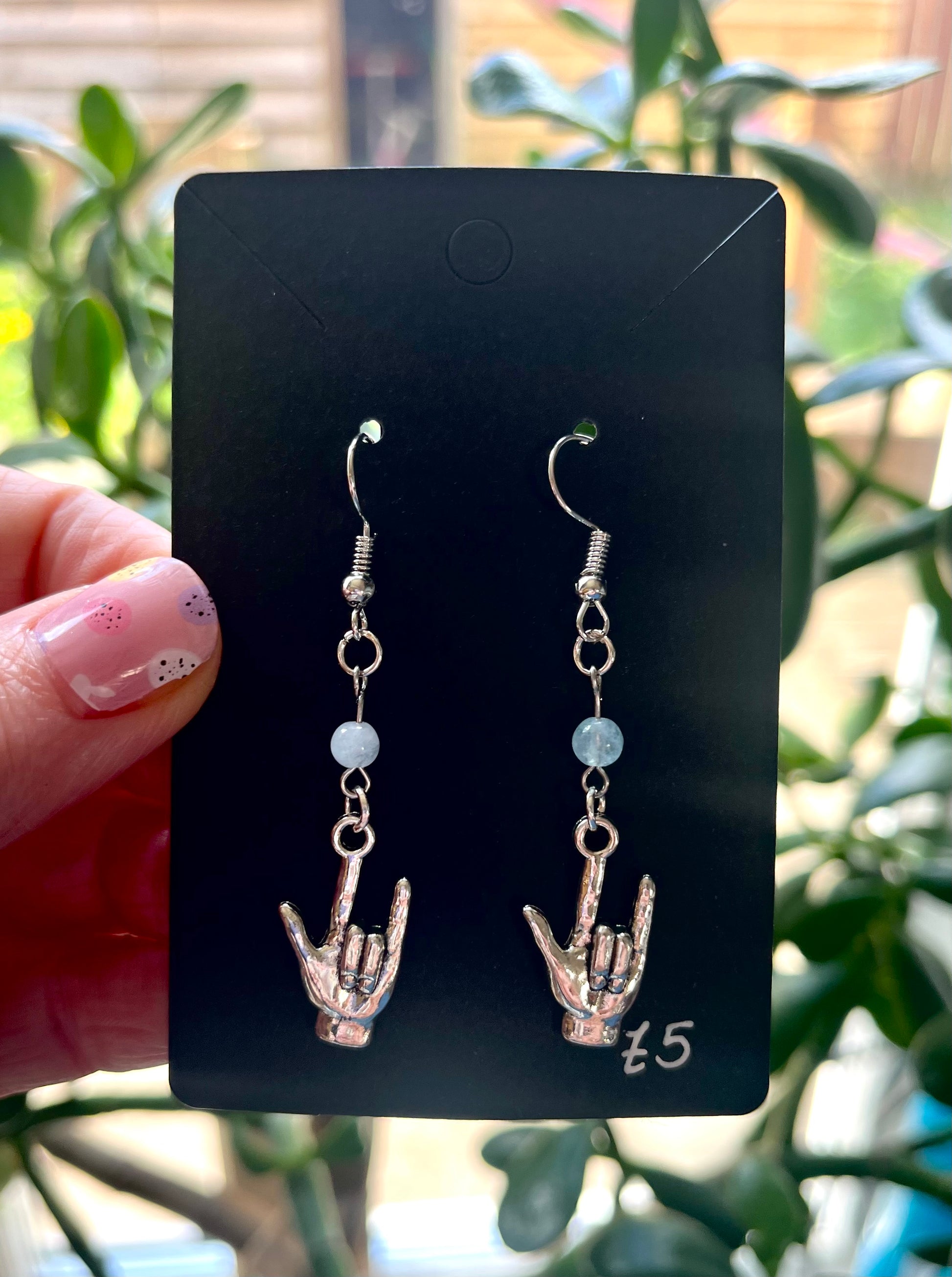 Show a little love with these charming earrings featuring “I Love You” hand sign charms, beautifully accented with aquamarine beads. The charms are crafted from zinc alloy (lead and nickel safe) and hang from silver-plated hooks for a polished look and comfortable wear.