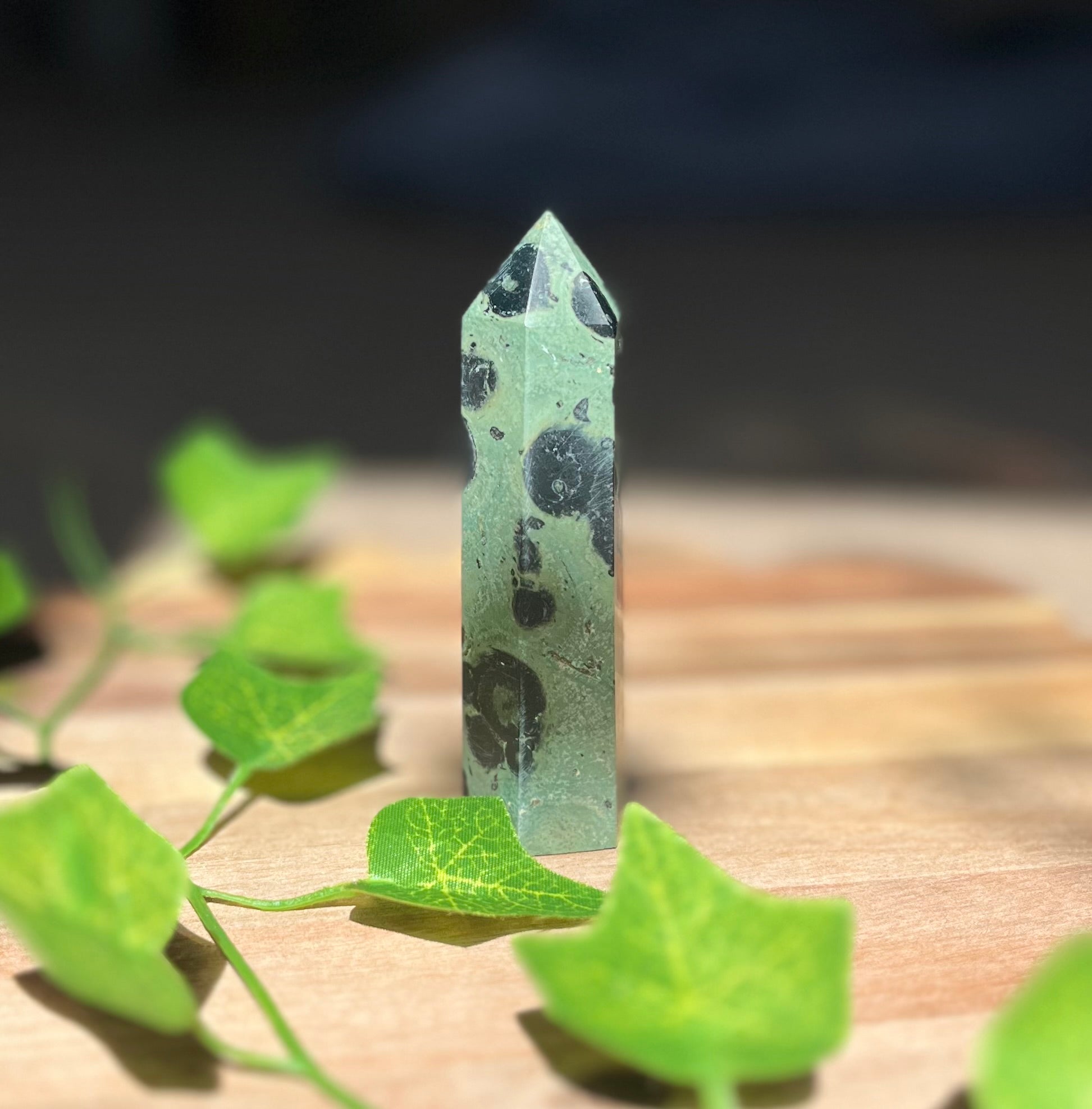 This 8.75cm Kambaba Jasper Tower showcases the unique, deep green and black swirling patterns that make this stone truly eye-catching. With a smooth, polished finish and natural orbicular markings, it’s a beautiful piece for any mineral or decor collection.