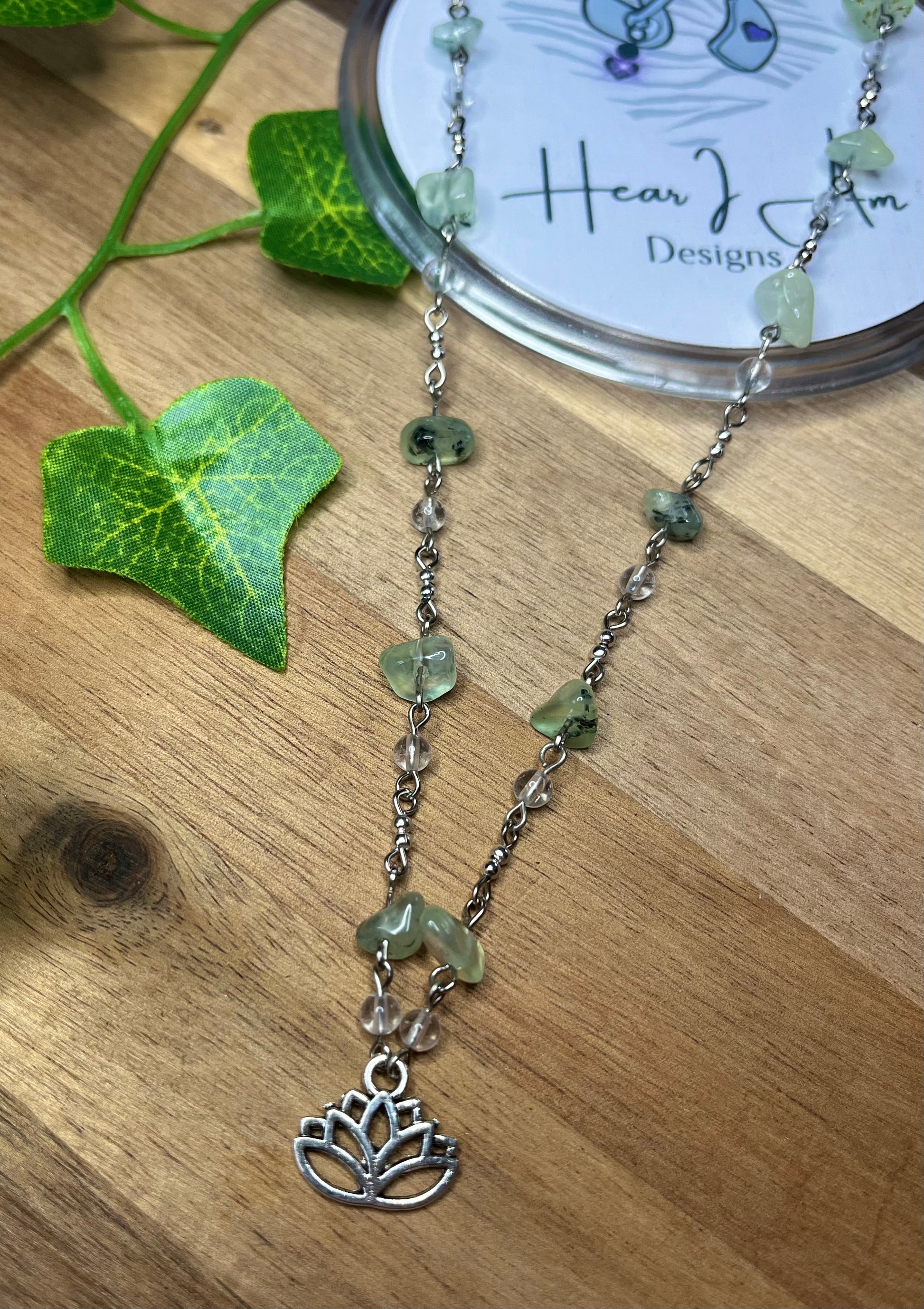 Lotus Beaded Necklace - Prehnite, Clear Quartz and Stainless Steel Beads