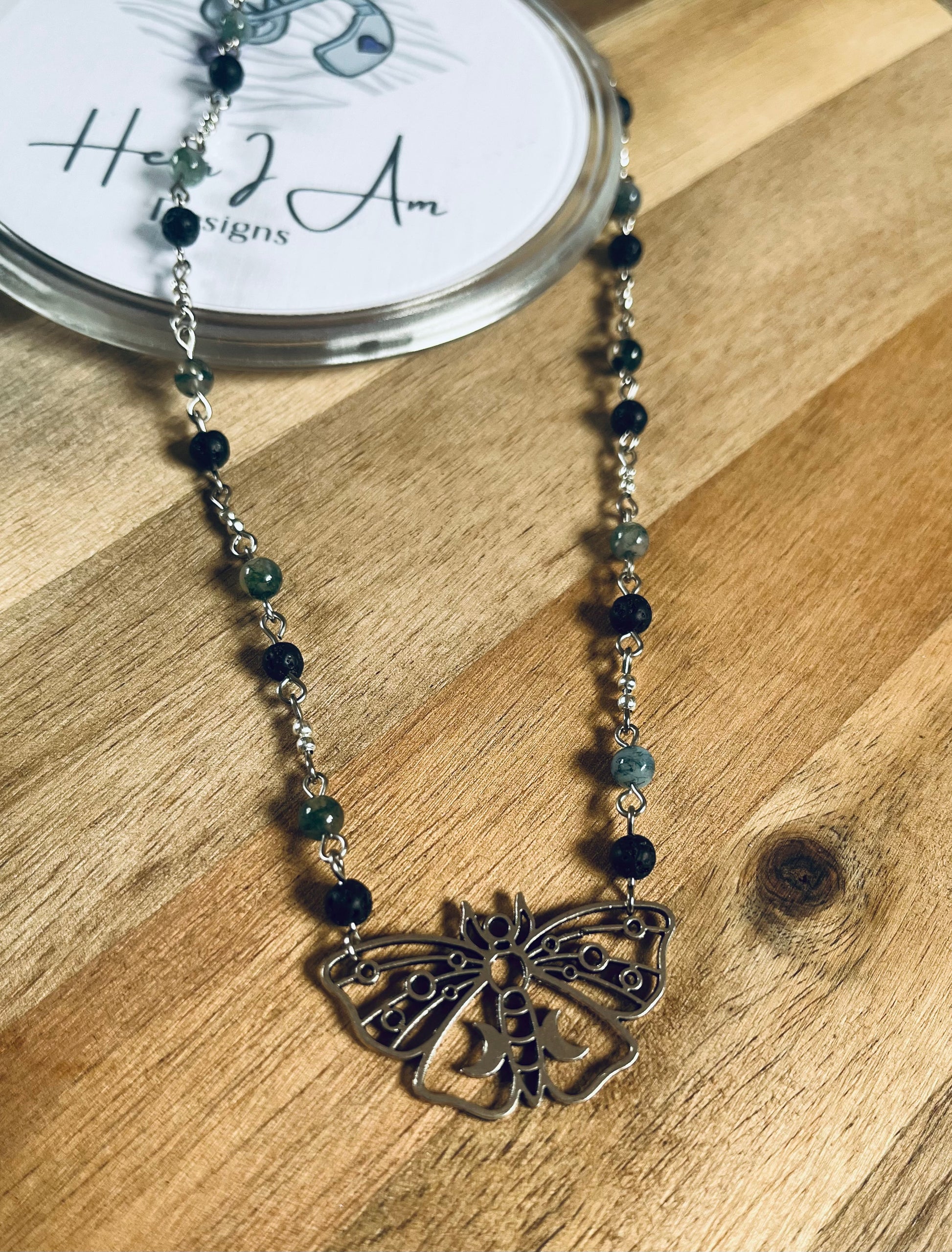 Lunar Moth Beaded Necklace - Moss Agate and Lava Stone