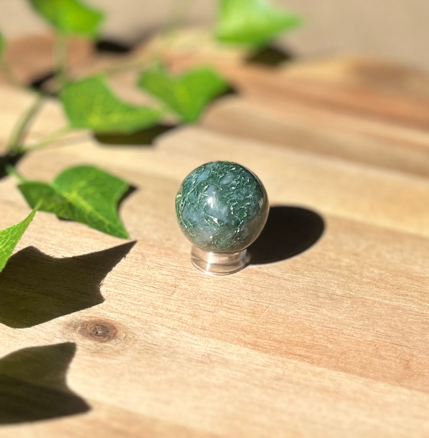 Each sphere features natural green mineral inclusions that resemble moss or foliage, giving every piece its own distinctive appearance. Polished to a high shine, this mini sphere is perfect for collectors or those who appreciate natural beauty in a compact form.