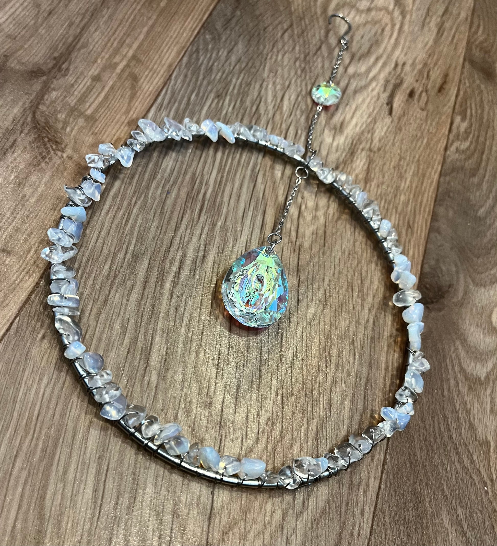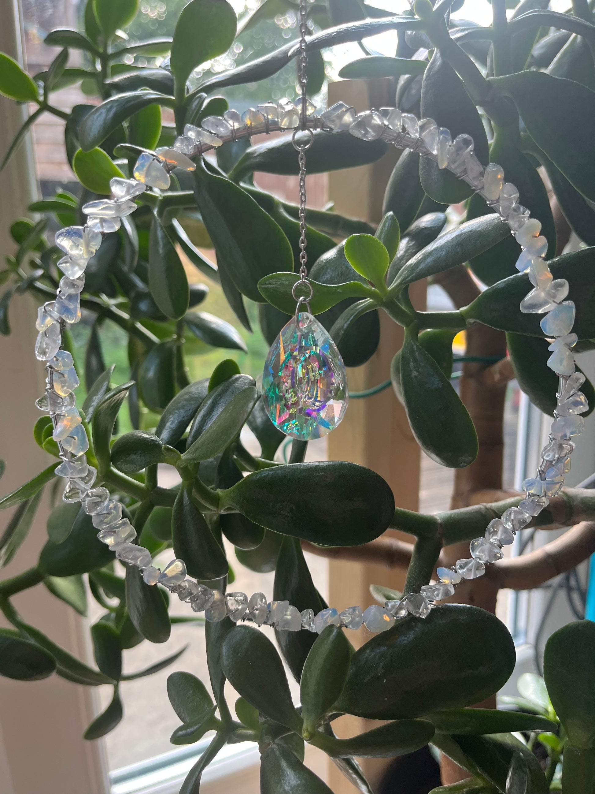 Add subtle light and texture to your space with our hand-beaded Opalite Chip Suncatcher.