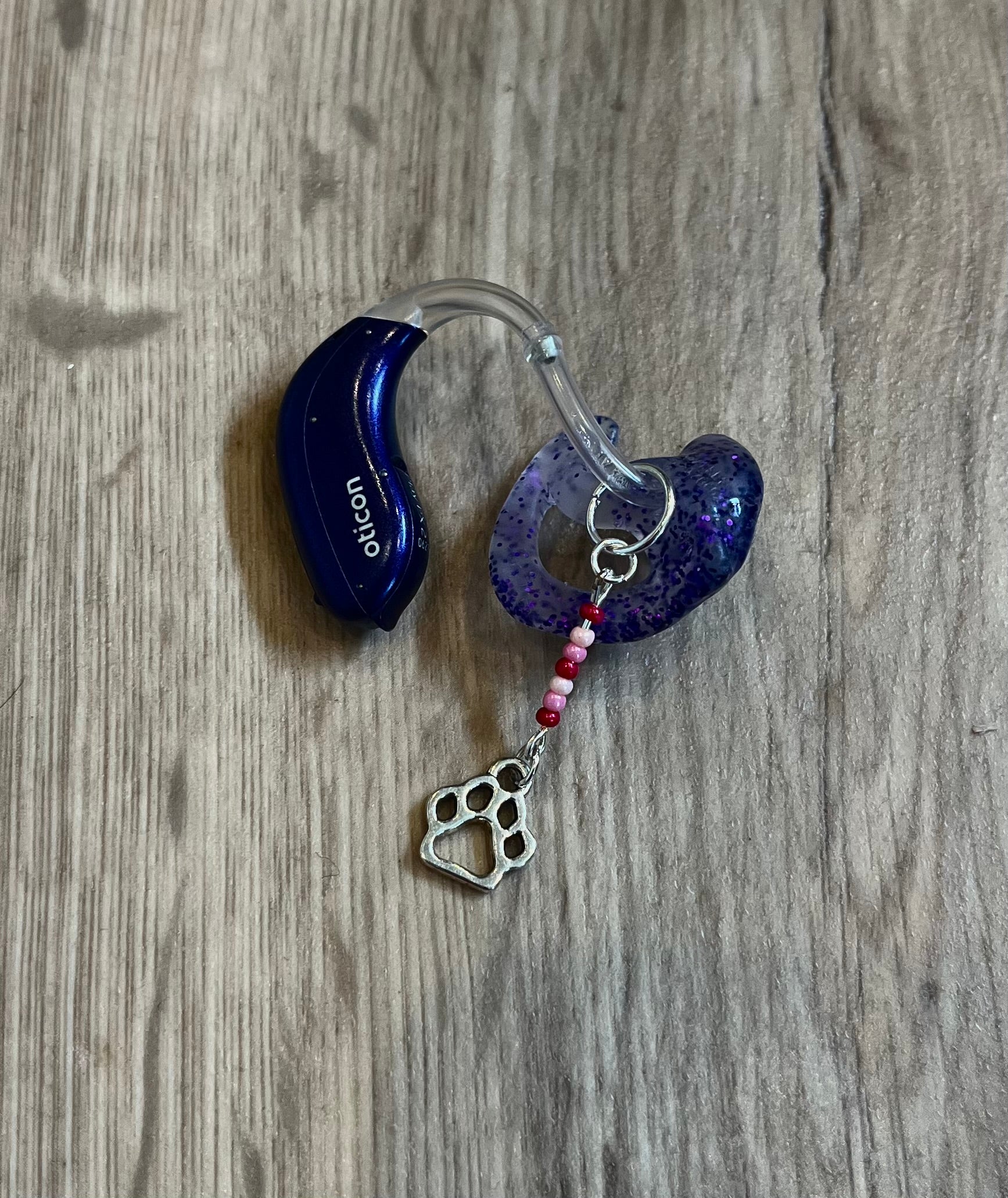 These hearing aid charms feature metal paw print charms paired with lightweight plastic beads and silver-plated hoops. A simple and fun way to add a bit of personality to your hearing aids.