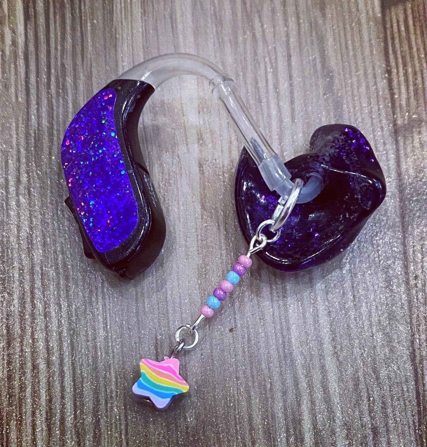 Brighten up your hearing aids with these fun and lightweight rubber star charms, paired with colourful plastic beads and sliver-plated hoops. A playful way to add some personality to your devices.