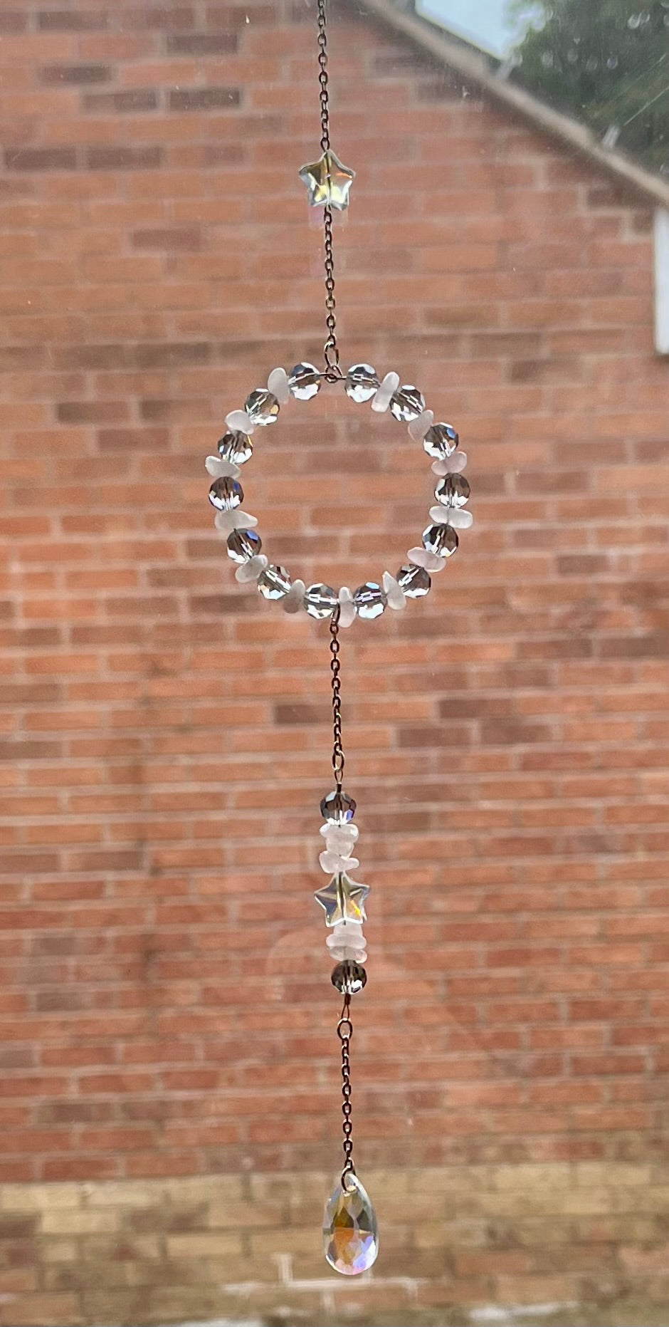 Add a dreamy glow to your space with this handcrafted Rose Quartz Suncatcher, designed with a mix of soft pink rose quartz chip beads, shimmering glass accents, and playful star-shaped glass elements. Suspended on a stainless steel chain and finished with prism beads that scatter rainbows, this suncatcher brings beauty and charm to any window, garden, or cozy corner.