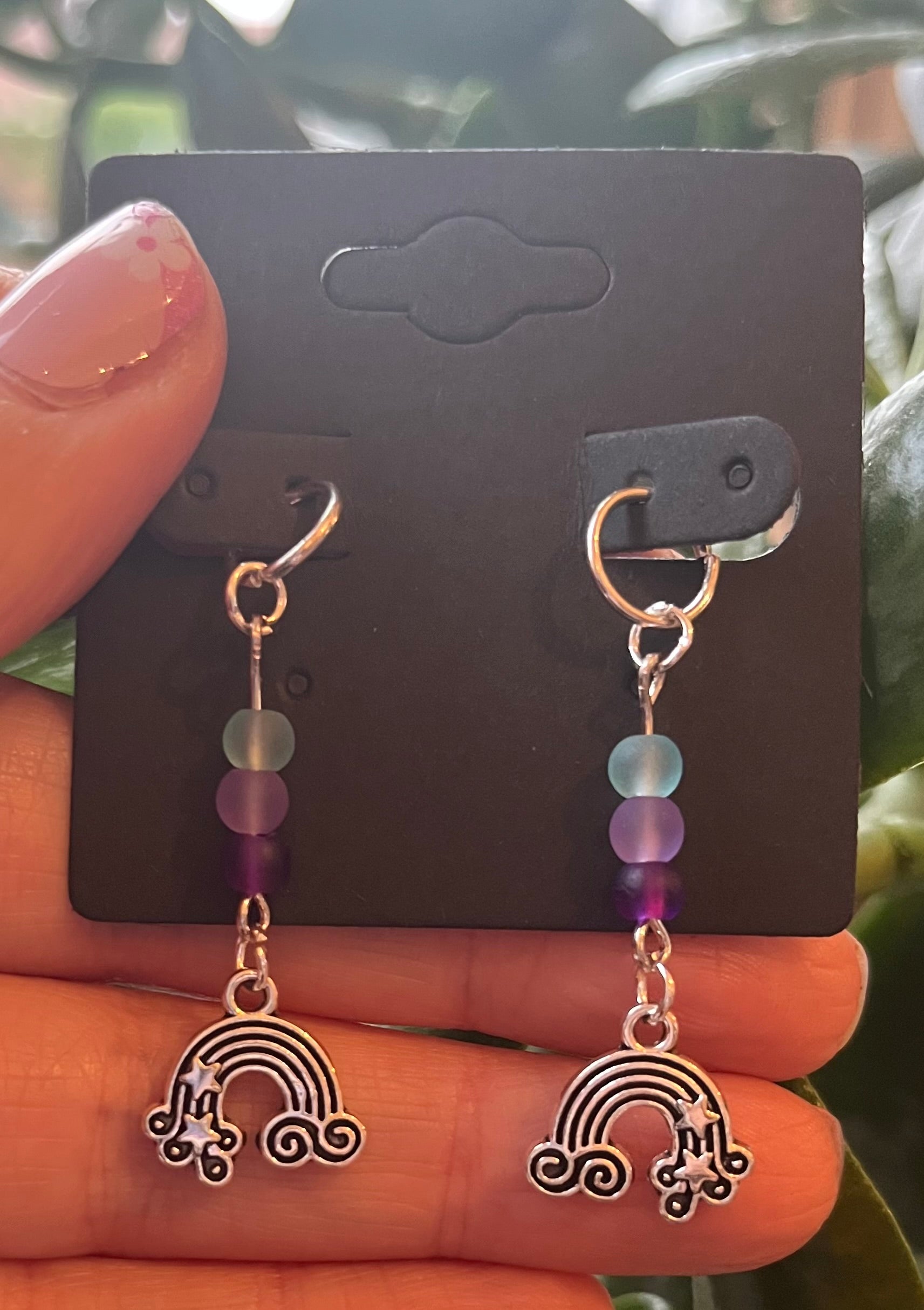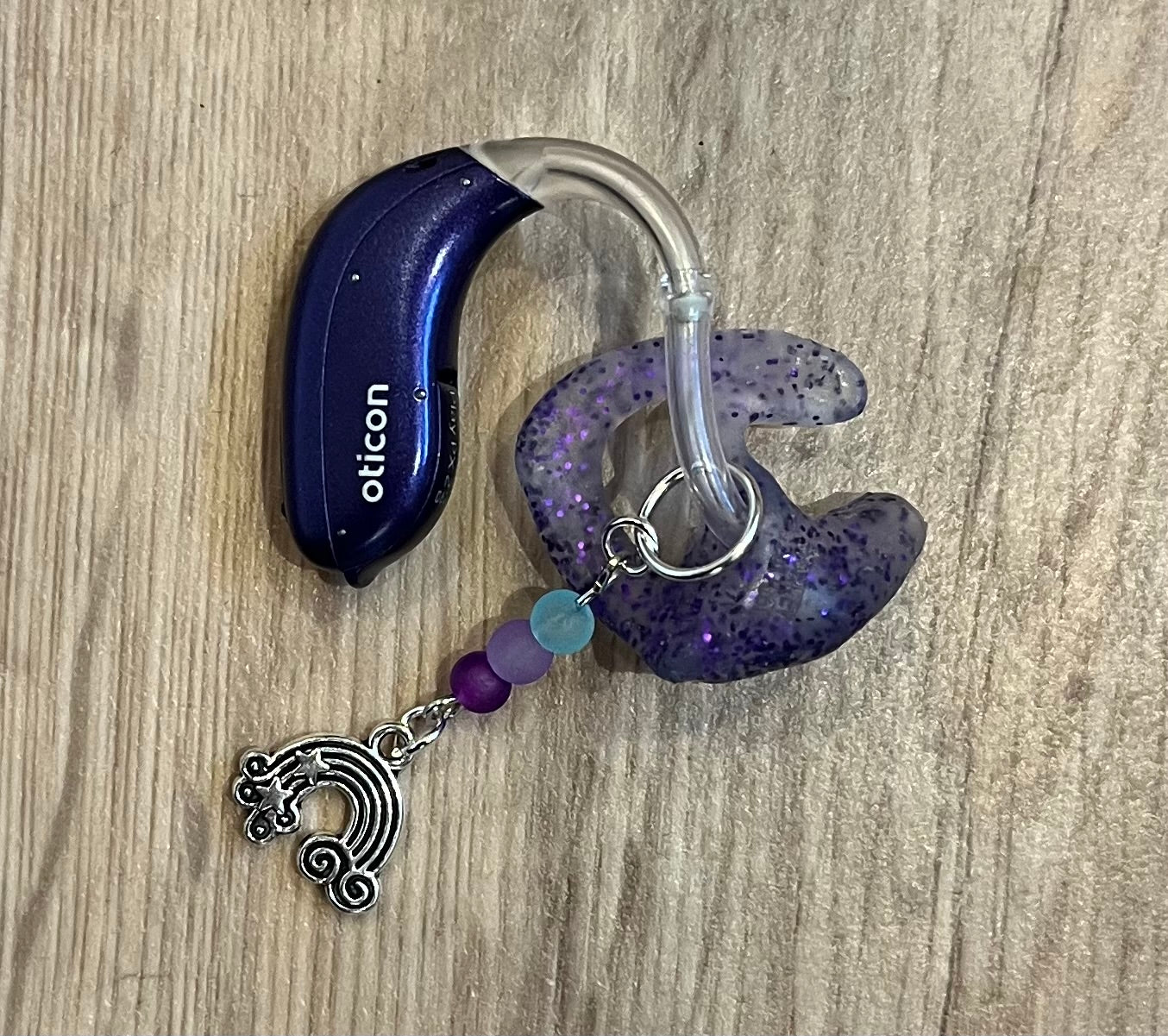 Add a splash of color and cheer to your hearing aids with these playful silver-tone rainbow charms, paired with sparkling glass beads. Fun, vibrant, and full of personality, they’re a perfect way to make your hearing aids feel more like you.