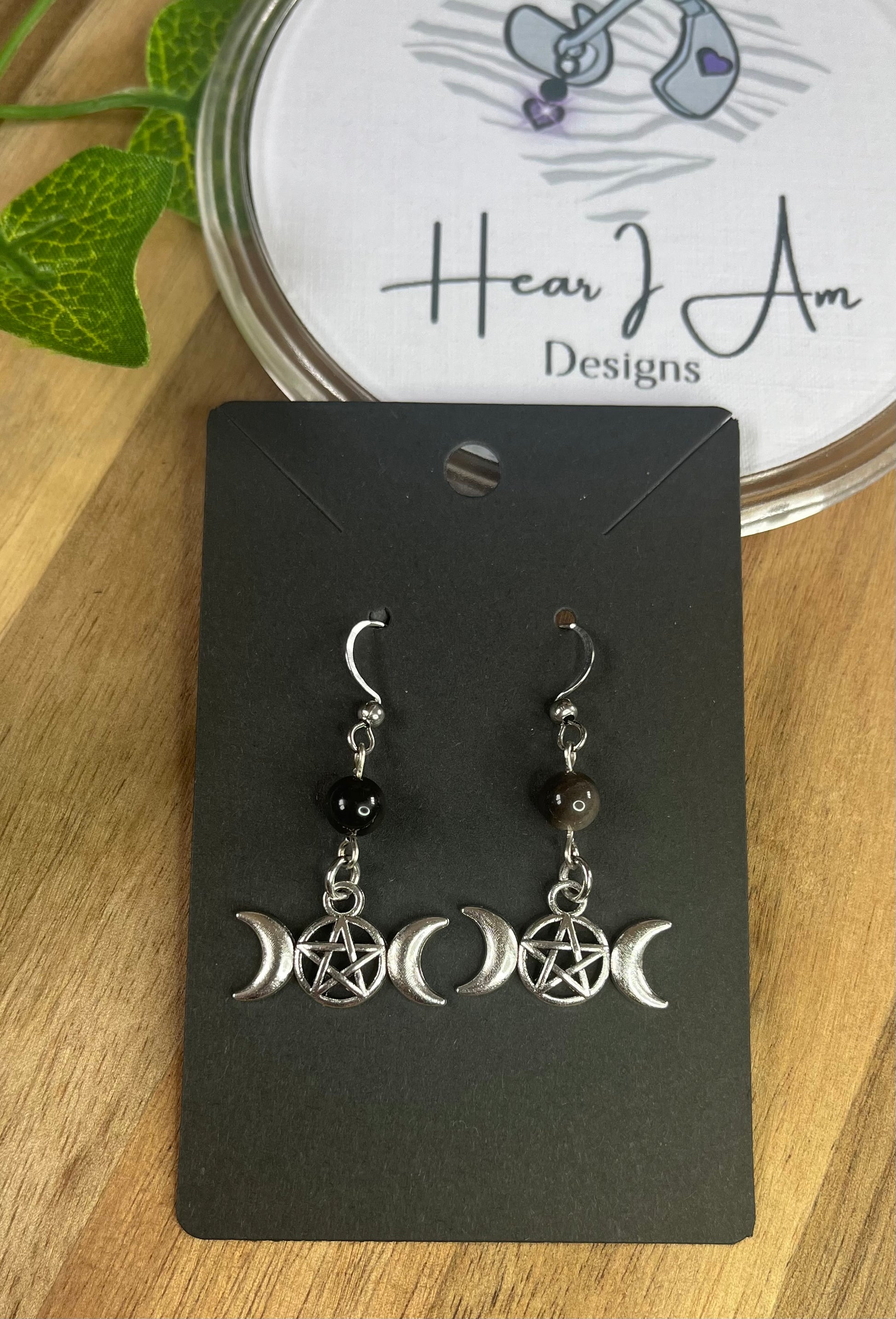 Celebrate the quiet power of the night sky with these celestial-inspired moon phase earrings, featuring smooth silver sheen obsidian beads and silver-toned moon phase charms. Suspended from stainless steel hooks, these earrings offer a striking yet subtle shine, perfect for lovers of lunar style and minimalist mystique.