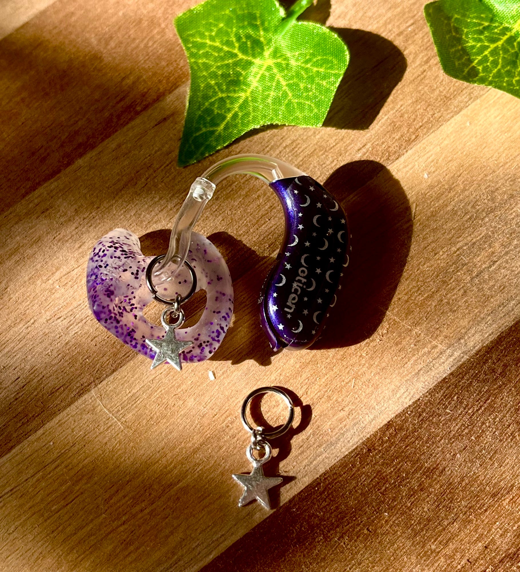 Add a little magic to your hearing aids with these elegant silver-tone star charms. Designed to clip onto standard hearing aid tubing, they’re a simple way to show off your unique style.