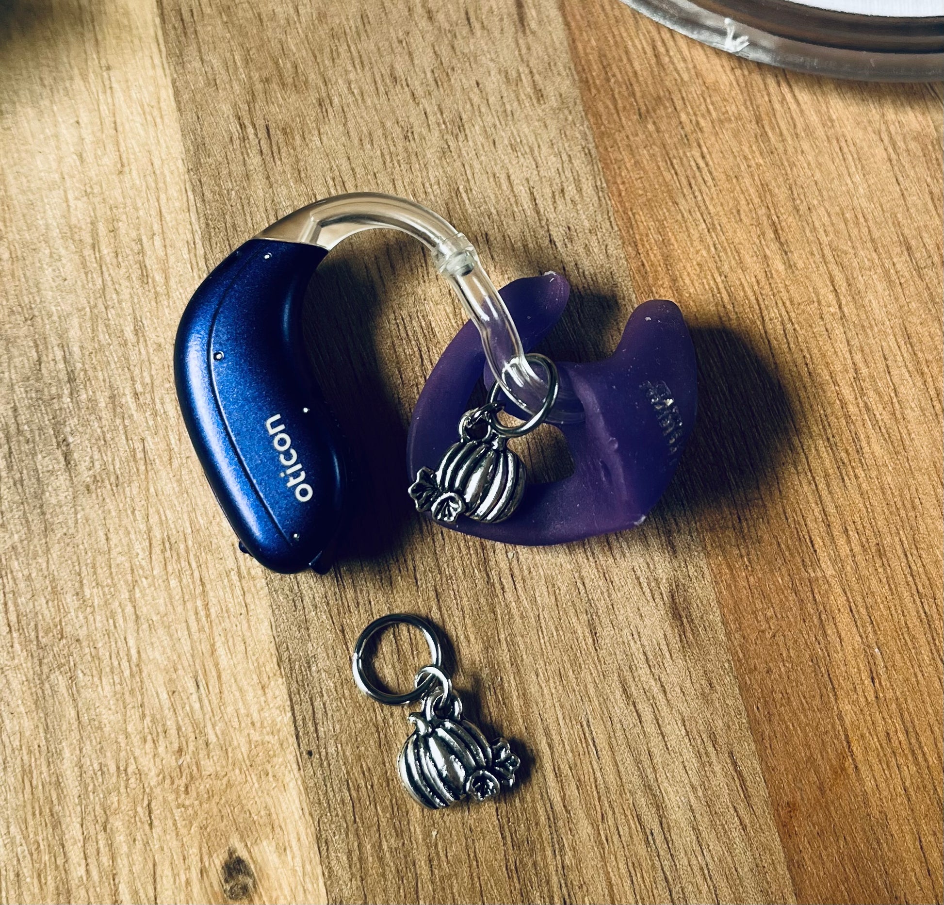 Each pumpkin charm hangs from a stainless steel hoop, carefully designed to fit hearing aids with standard tubing that can be gently disconnected from the device. To wear, simply slide the hoop onto your tubing and reconnect—easy, quick, and secure.