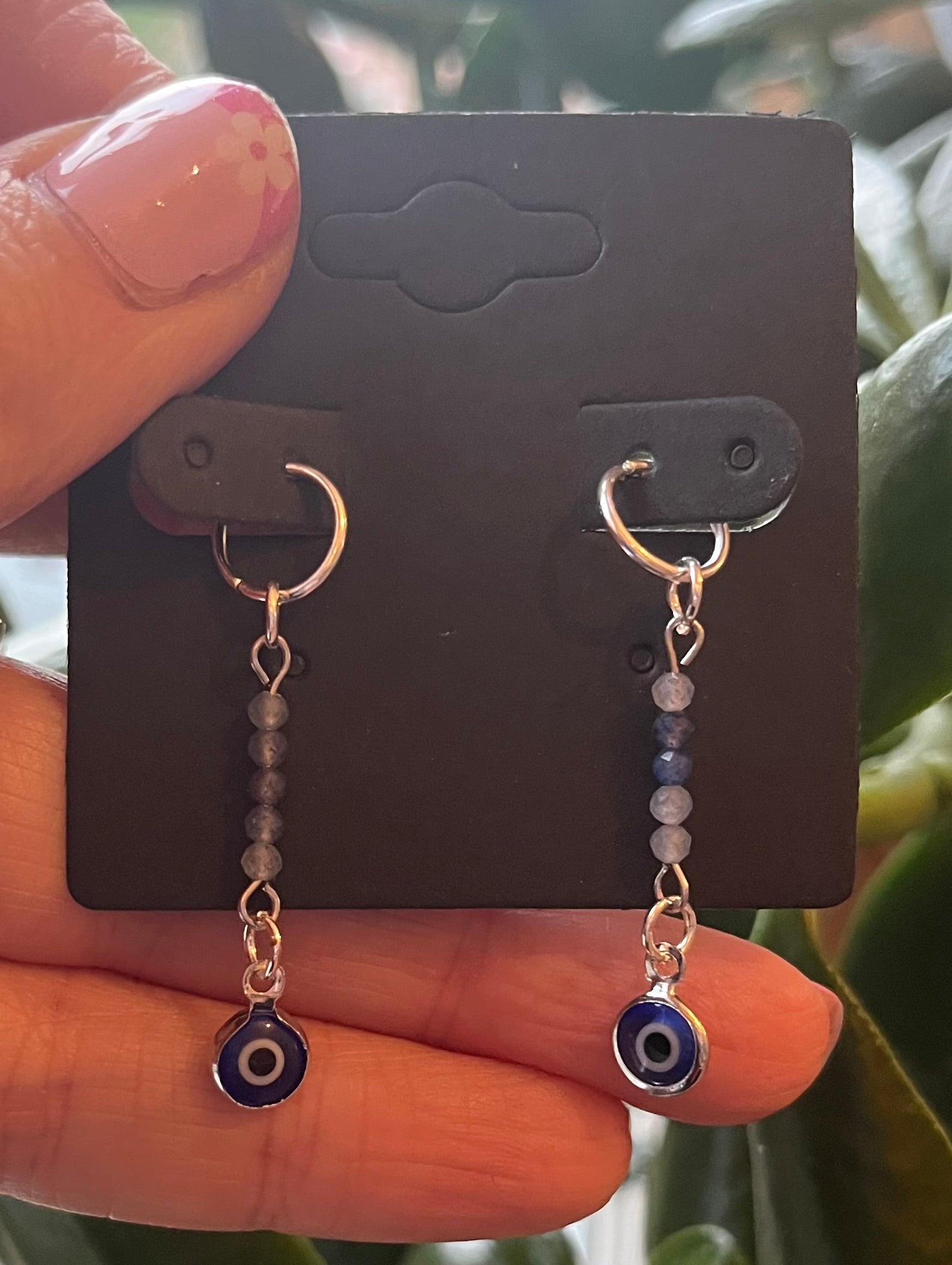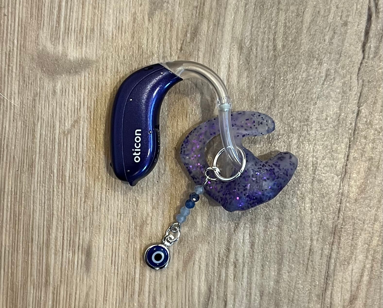 Add a mystical touch to your hearing aids with these enchanting charms featuring silver-tone and enamel magic eyes, accented by tiny faceted sodalite beads. Thoughtfully designed to bring both style and personality to your everyday wear.