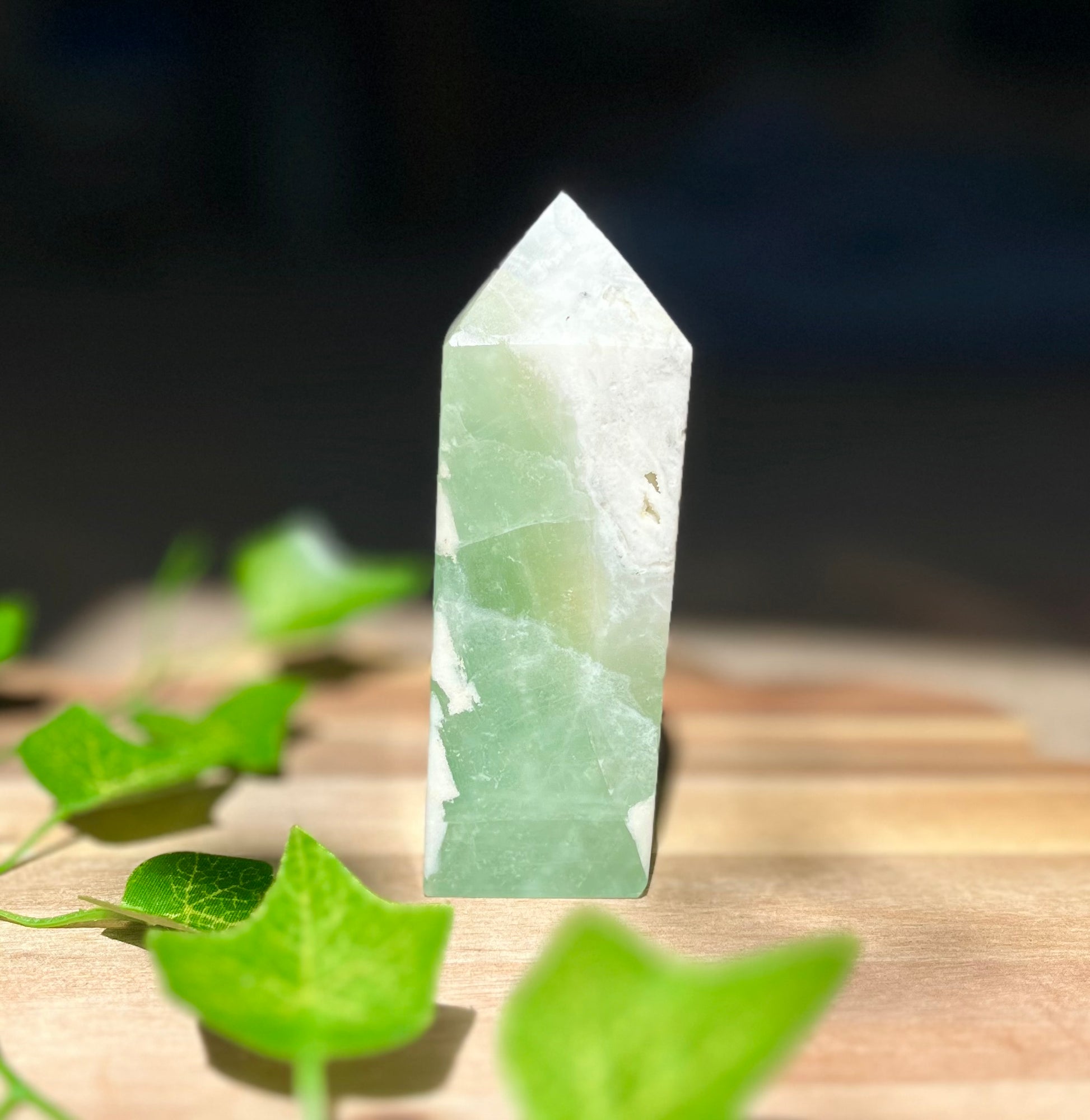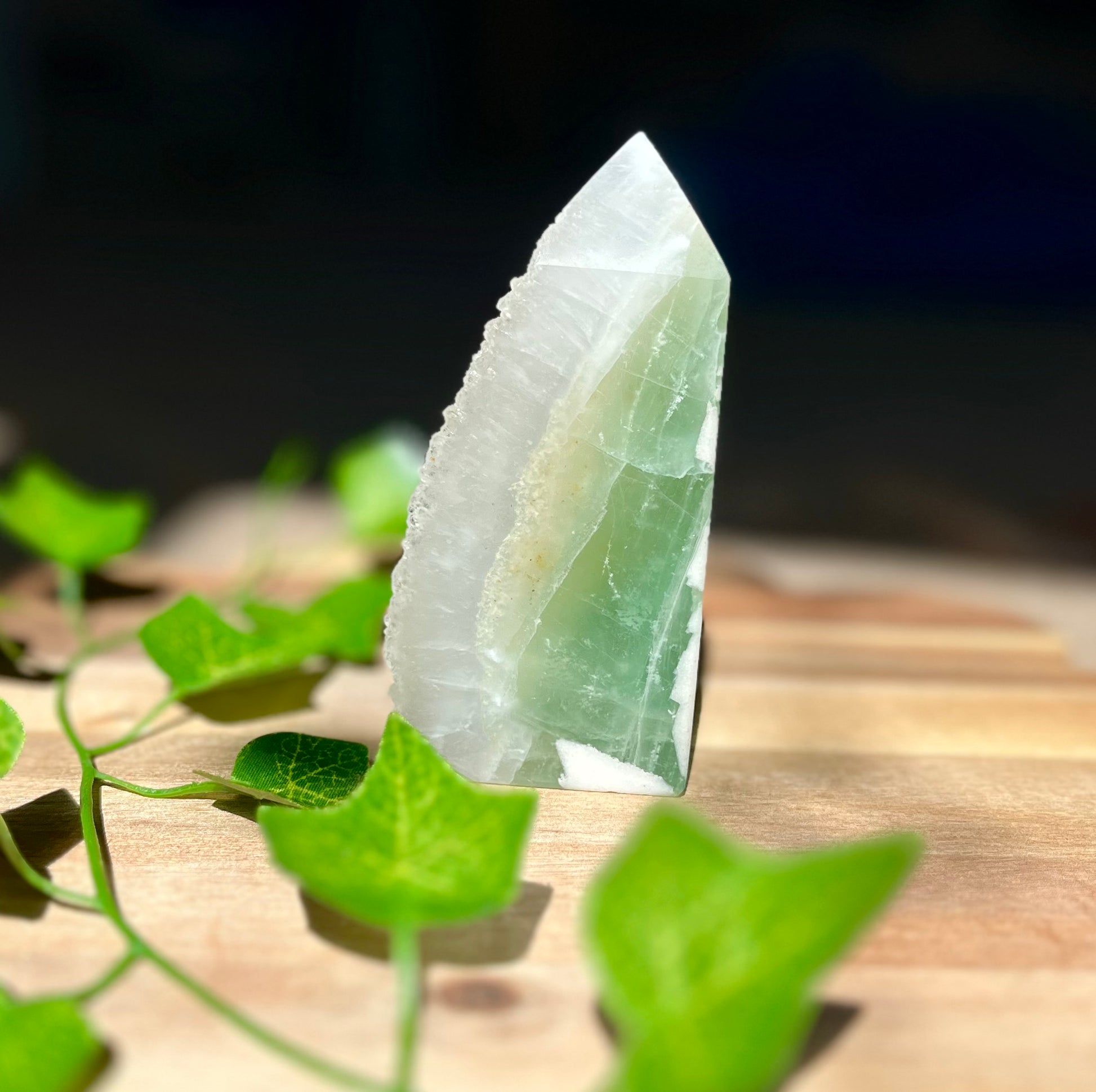 This 10.5cm Green Sugar Fluorite Tower is a stunning display piece that beautifully showcases the contrast between craftsmanship and natural mineral texture. One side is polished, revealing the vivid green bands of fluorite, while the other side remains raw, with a sparkling “sugar” texture that glitters under the light.